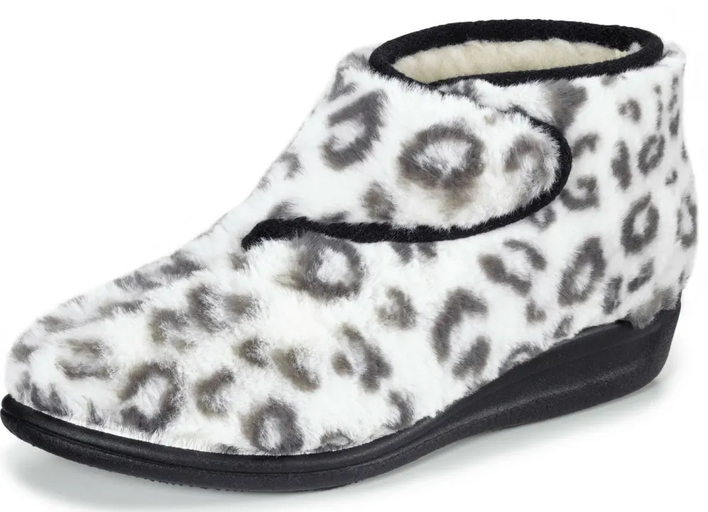 Klett-Stiefelette in Weiß-Schwarz aus kuscheligem Plüsch: in Weite H, Warmfutter und Fußbettbezug aus reiner Schurwolle, superleichte PVC-Laufsohle sowie 25 mm Keilabsatz