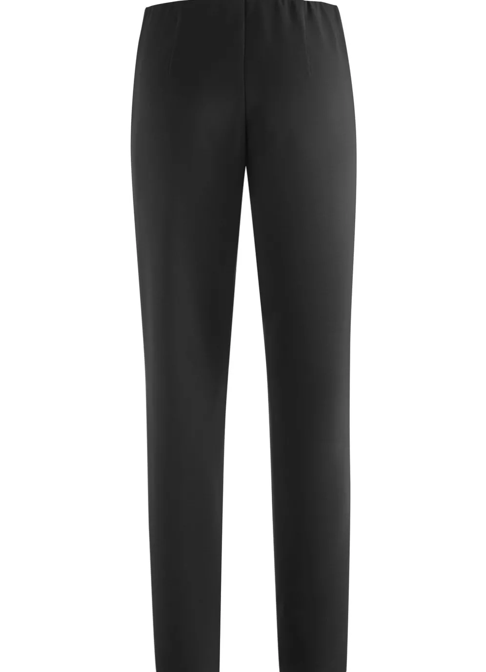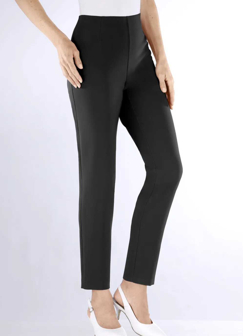 Attraktive, knöchellange Hose mit angeschnittenem Bund, glatt anliegend dank der innenliegenden Gummibund-Einlage sowie figurformende Abnäher im Vorder- und Rückteil. Innenbeinlänge ca. 71 cm, Fußweite ab 30 cm.