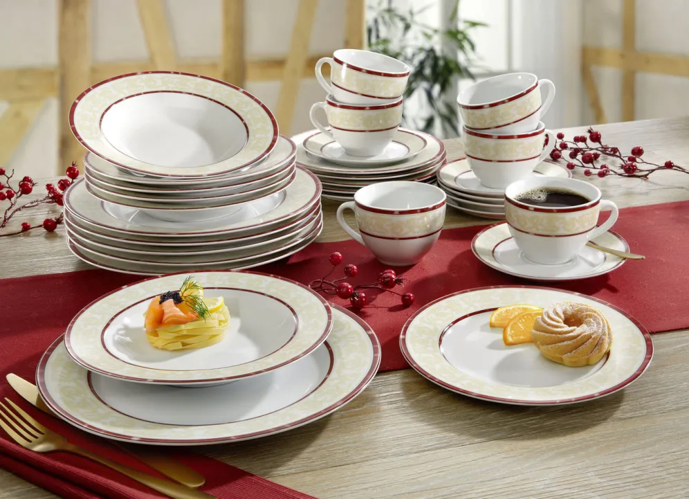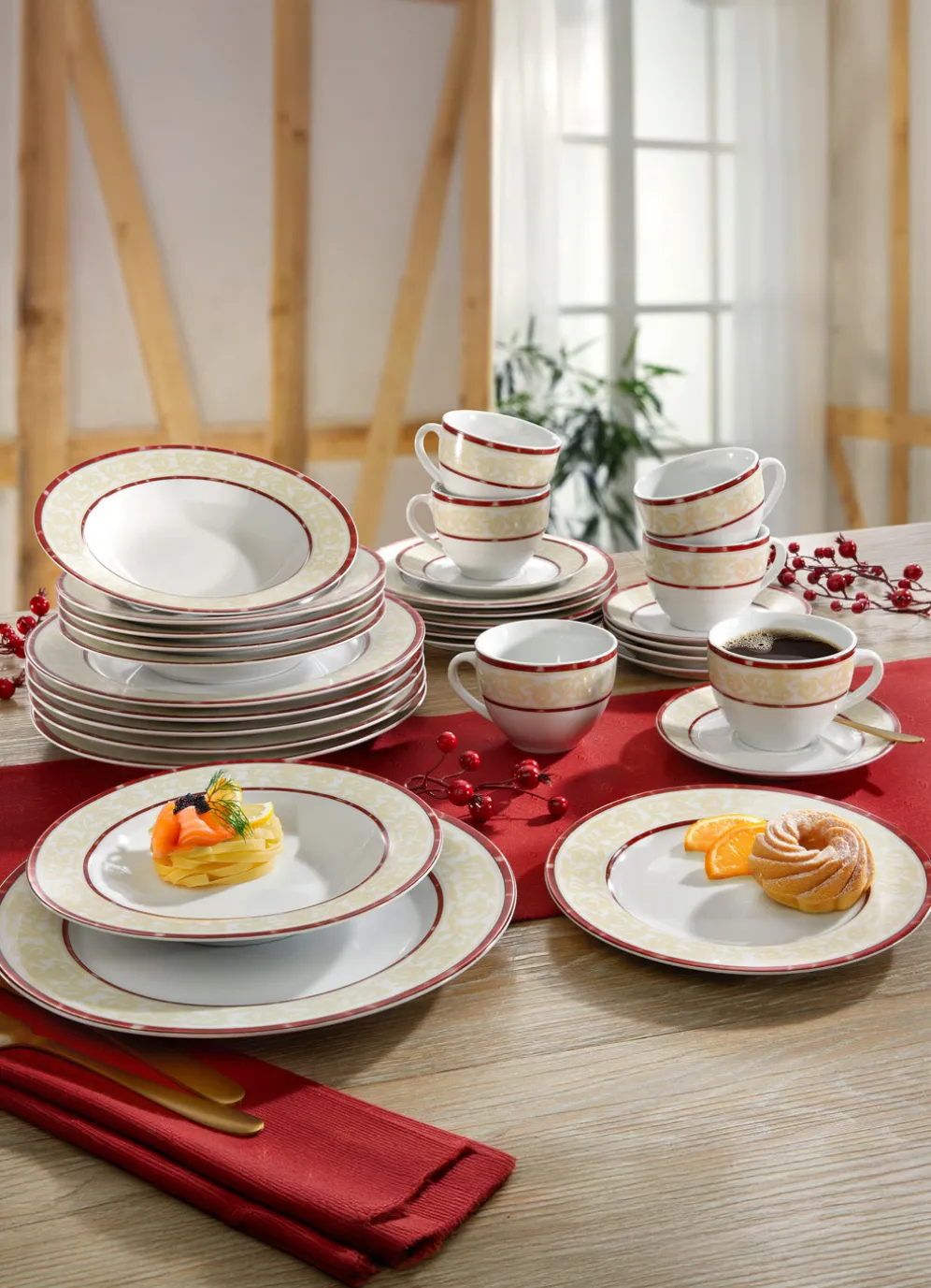 Hochwertiges 30-teiliges Porzellan-Service aus dem Hause Arte Viva. Mit rotem Rand und verspieltem cremefarbenen Dekor, das wunderbare Akzente auf Ihre Tafel zaubern wird! Von Sternekoch Thomas Wohlfahrter empfohlen! Das Service ist spülmaschinen- und mikrowellengeeignet und besteht aus je 6x: Speiseteller (ø 26,5 cm), Tasse (Inhalt 25 cl, ø 9 cm, Höhe 7 cm), Untertasse (ø 15 cm), Dessertteller (ø 20,5 cm), Suppenteller (ø 22 cm, Höhe 3,4 cm).