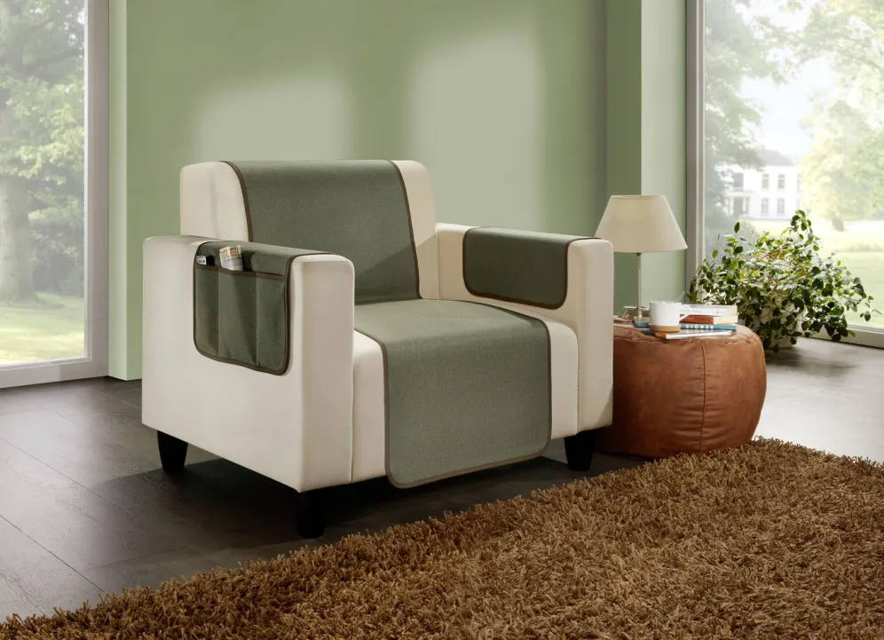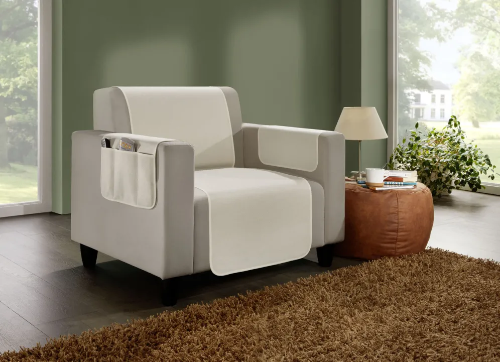 Von den Armlehnenschonern ist einer mit praktischen Taschen gefertigt. Die Qualität: 100% Polyester.