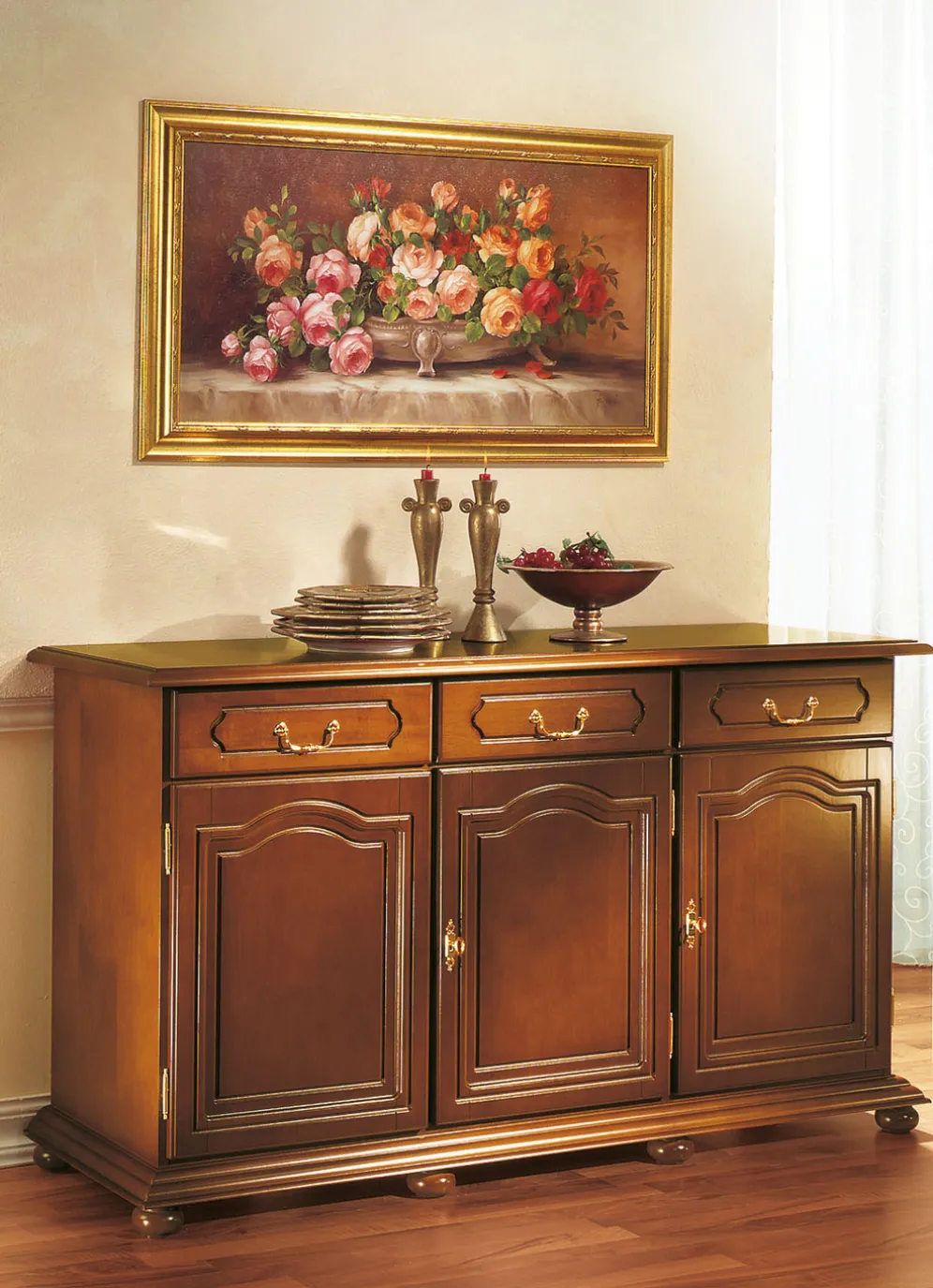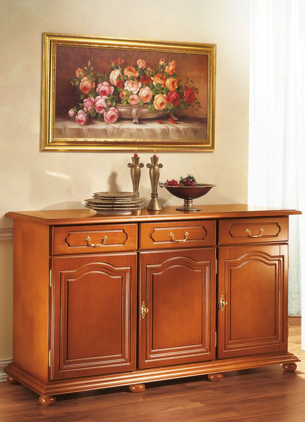 Teilmassive Möbel mit Echtholzfurnier, goldfarbenen, geschwungenen Griffen an den Schubladen sowie Kugelfüßen. Die Lieferung erfolgt aufgebaut.