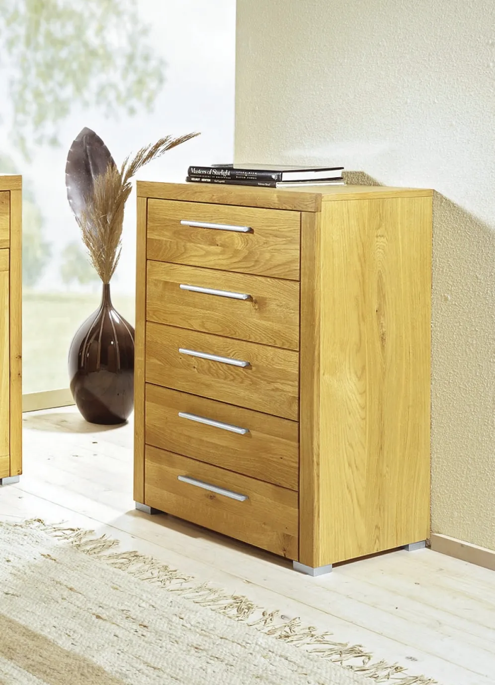 Ansprechende Möbelserie mit massiver Front und furniertem Korpus. In Wildeiche ist die Oberfläche geölt, in Kernbuche mit Wachseffektlack. Schubladen mit Softclose-Beschlägen. Die Lieferung erfolgt aufgebaut