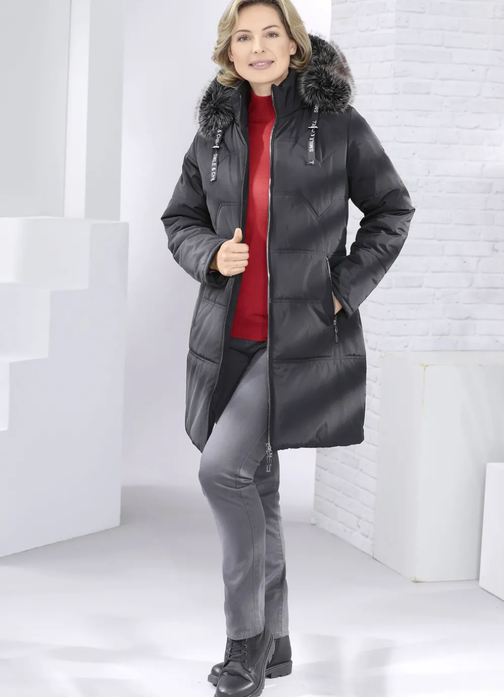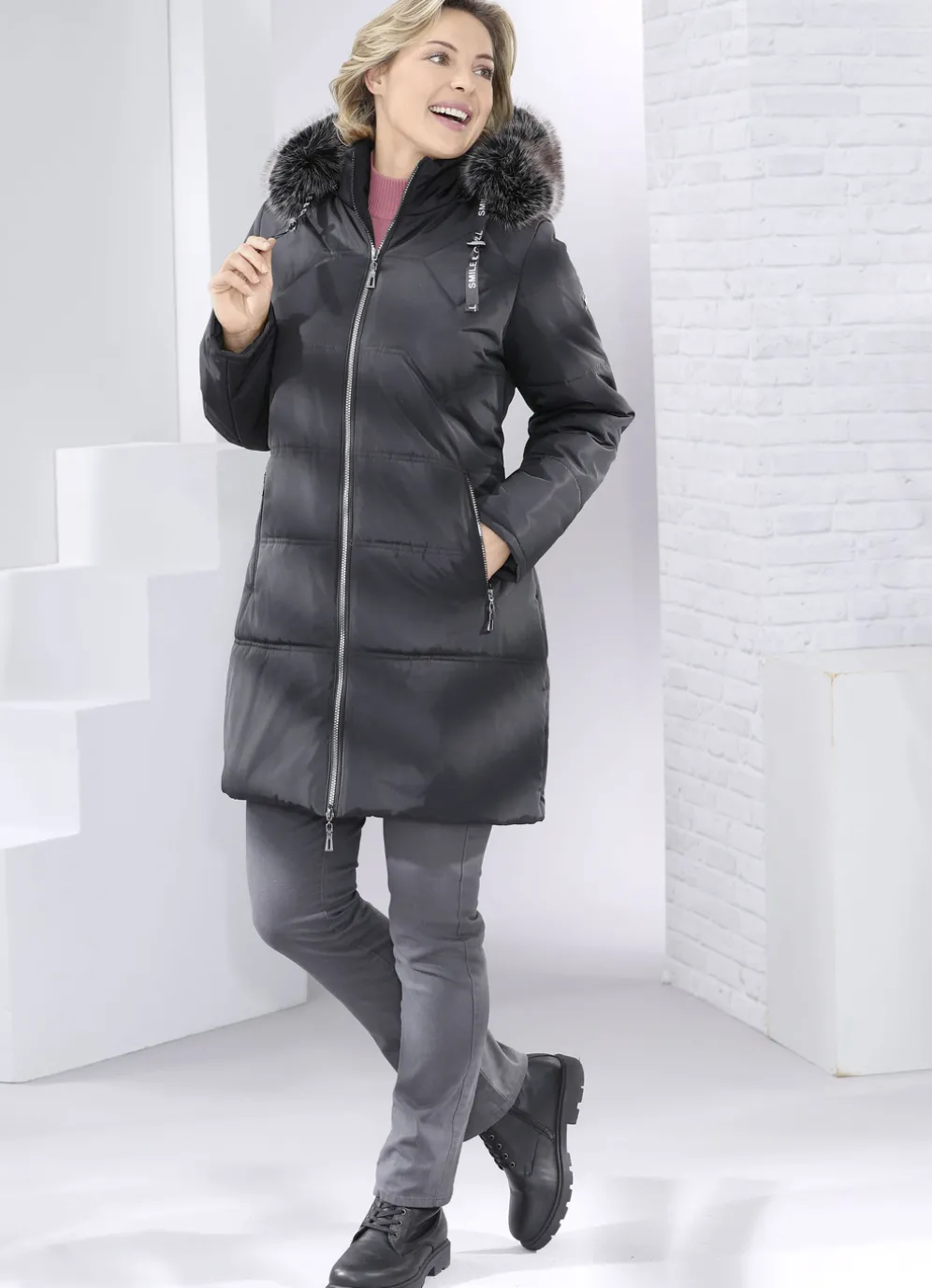 Geschmackvoller Kurzmantel mit Durchzugsband und Stopper im Saum und in der abnehmbaren Kapuze mit abnehmbarem Kunstpelz-Besatz, durch 2-Wege-Reißverschluss hoch schließbarem Stehkragen sowie Reißverschlusstaschen. Länge ca. 90 cm.