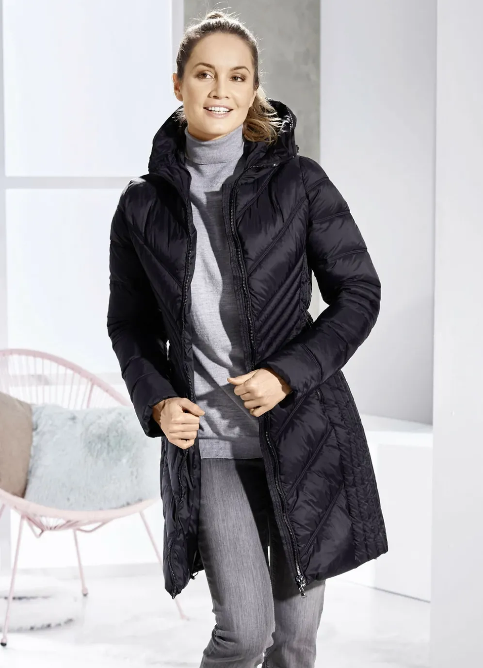Schwarzer Kurzmantel mit seitlich figurgünstiger Längssteppung: feste Kapuze mit Durchzugsband und Stopper, Reißverschlussleiste, Taschen mit Reißverschluss sowie Windfangärmel aus Rippenstrick. Länge ca. 90 cm.