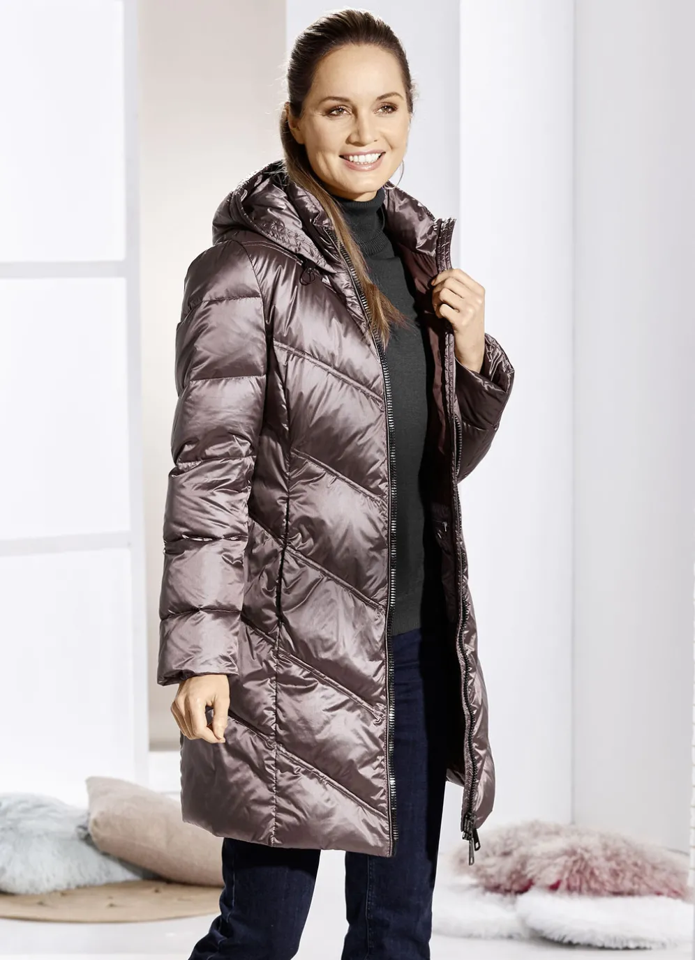 Faszinierender Kurzmantel in Mauve: feste Kapuze mit Durchzugsband und Stopper, durch 2-Wege-Reißverschluss hoch schließbarer Stehkragen, nahtfeine Reißverschlusstaschen, umschlagbare Ärmel sowie eine Innentasche. Länge ca. 90 cm.