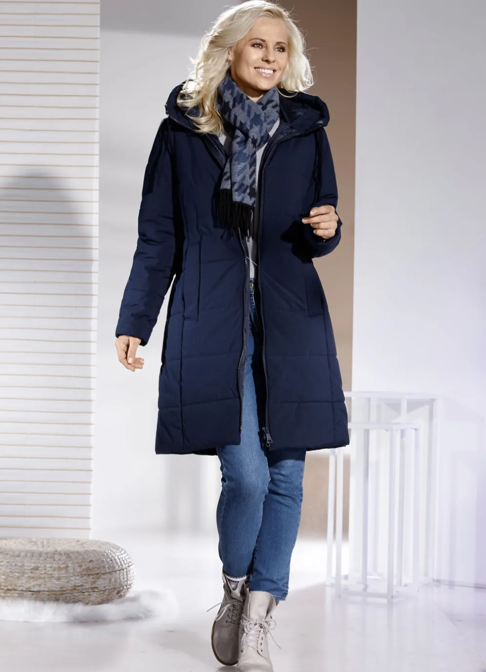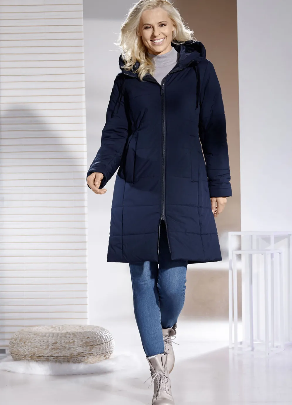 Stilsicherer, nachtblauer Kurzmantel mit Bindeband an der festen Kapuze, durch 2-Wege-Reißverschluss hoch schließbarem Stehkragen, breiter Blende an den Schubtaschen, elastischen Ärmelabschlüssen sowie einer Innentasche. Länge ca. 97 cm, ab Gr. 40 ca. 99 cm, ab Gr. 44 ca. 101 cm, ab Gr. 46 ca. 103 cm, ab Gr. 52 ca. 105 cm. Die Qualität: Micro-Popeline, Taftfutter und Watte jeweils aus 100% Polyester. Waschbar
