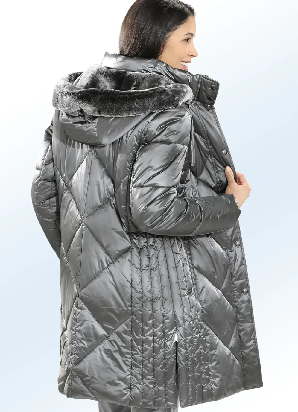 Interessanter Kurzmantel in der modischen Farbe Titan und seitlich figurfreundlicher Längssteppung: abnehmbare Kapuze mit Durchzugsband, Stopper, festem Kunstpelz-Besatz und kuschelweicher Kunstpelz-Innenausstattung, Stehkragen durch Reißverschluss unter der Druckerleiste hoch schließbar, Reißverschluss an Paspeltaschen und Seitenschlitzen, umschlagbare Ärmel sowie eine Innentasche. Länge ca. 90 cm.