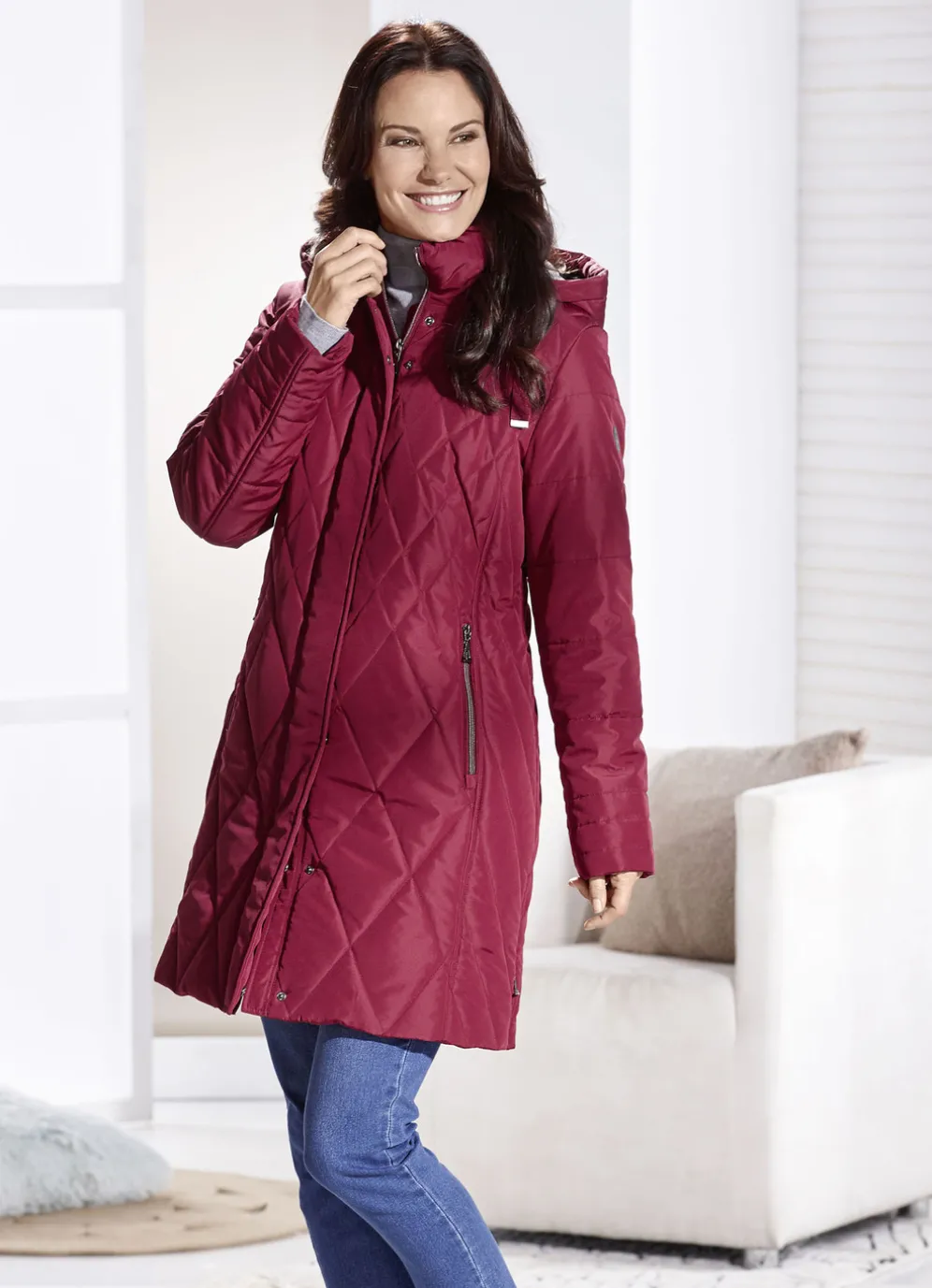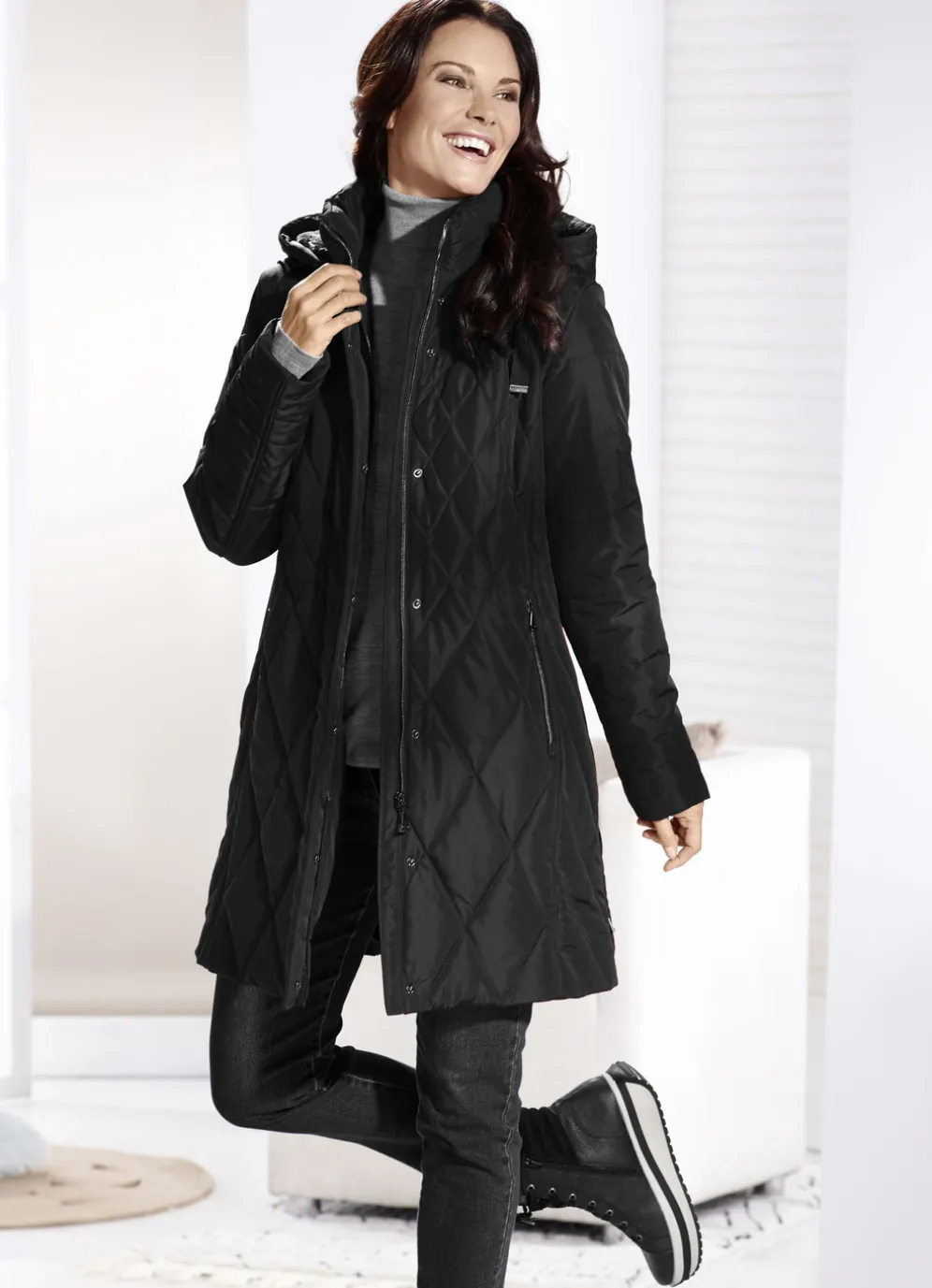 Fabelhaft femininer Kurzmantel mit Durchzugsband und Stopper an der abnehmbaren Kapuze mit Kunstpelz-Innenausstattung, durch Reißverschluss unter verdeckter Druckerleiste hoch schließbarem Stehkragen, Reißverschluss an den Taschen und Seitenschlitzen sowie einer Innentasche. Länge ca. 90 cm.