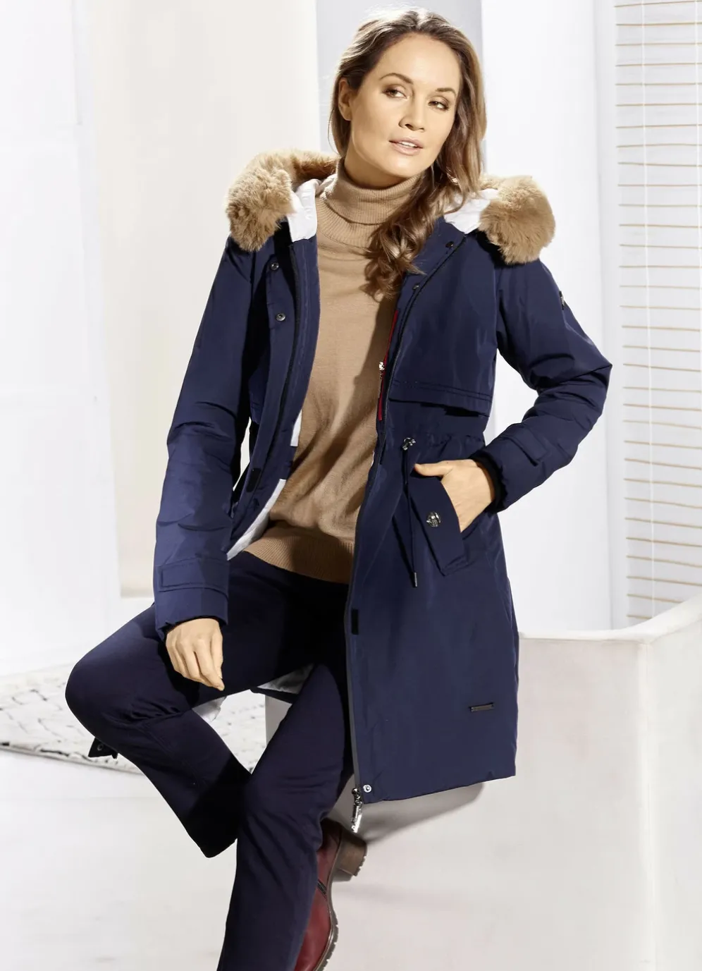 Dieser marinefarbene Kurzmantel präsentiert sich stilsicher: feste Kapuze mit abnehmbarem Kunstpelz-Besatz, 2-Wege-Reißverschluss, Drucker und verdeckte Klettleiste, Durchzugsband und Stopper in der Taille, Schubtaschen mit Patte und Zierdrucker, Riegel mit Klett und Windfang aus Rippenstrick an den Ärmelabschlüssen, eine Innentasche sowie Vorder- und Rückteilkoller. Länge ca. 93 cm, ab Gr. 46 ca. 94 cm.