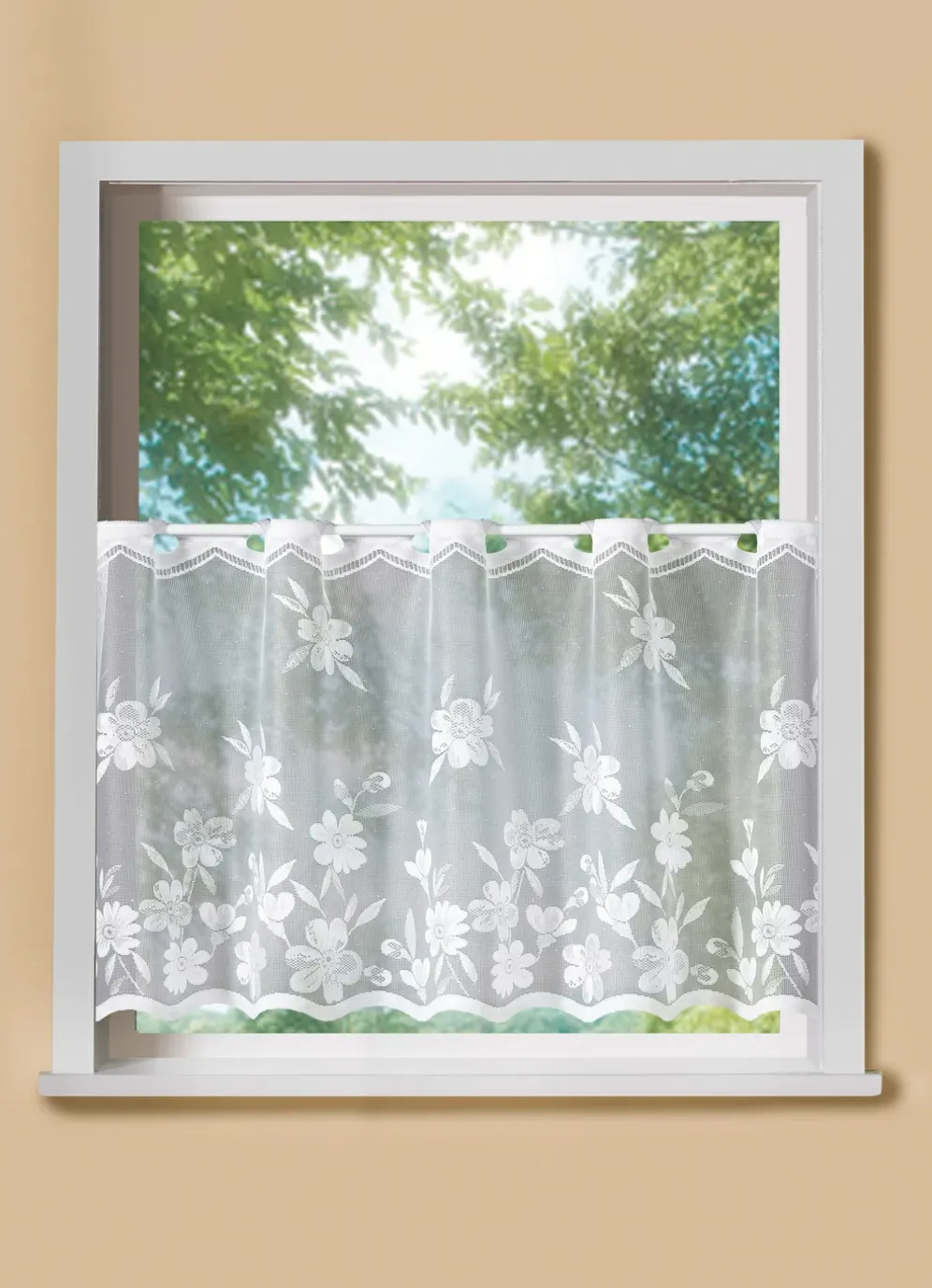 Einen wunderbar blumigen Ausblick beschert Ihnen dieser floral dessinierte Kurzstore mit Stangendurchzug! Unten ausgebogt und seitlich gesäumt. Die Qualität: Jacquard aus 100% Polyester.