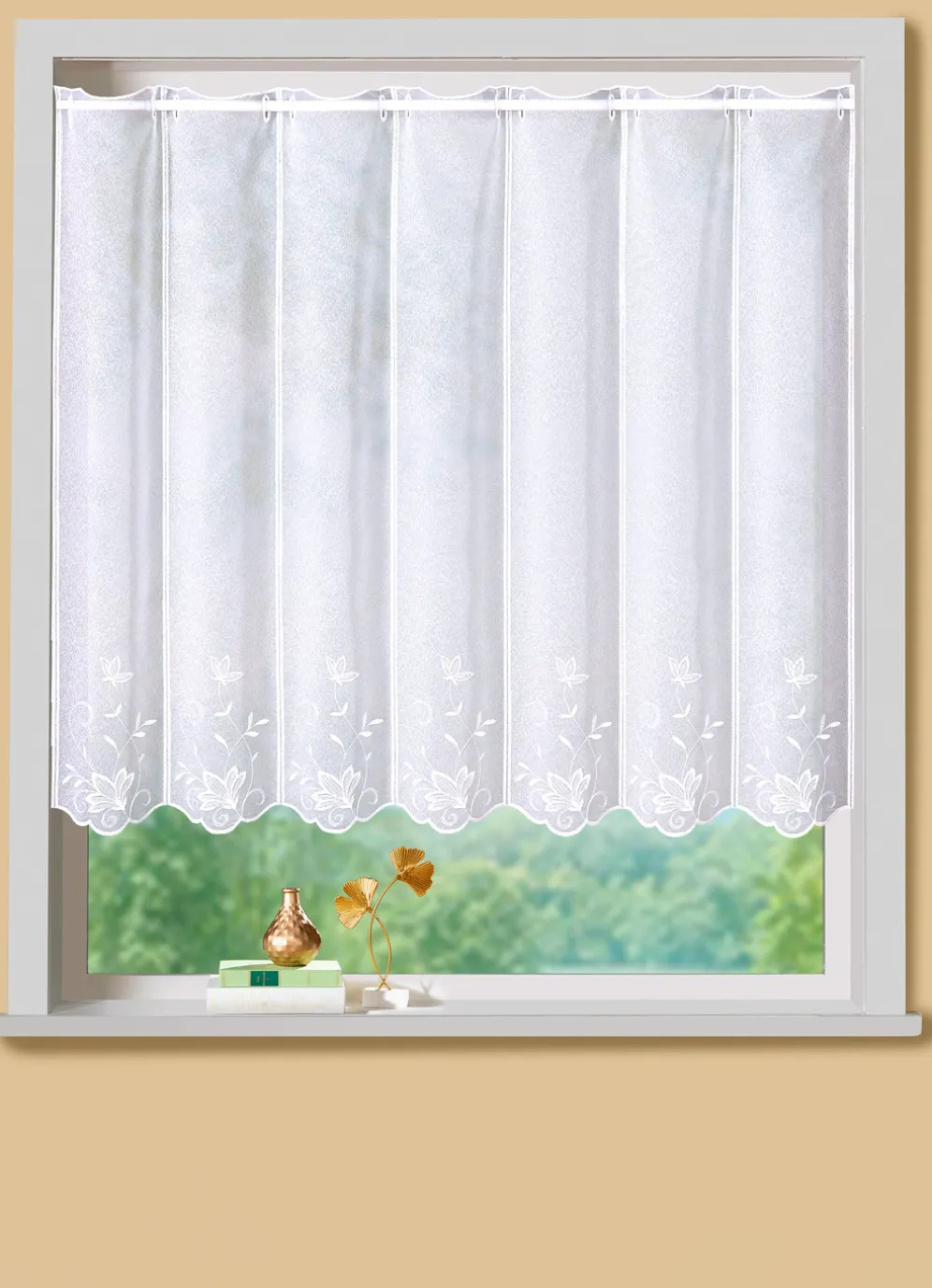Kurzstore mit Blätter-Stickerei und Stangendurchzug in Größe 660 (H30xB 90 cm) und in Weiss.