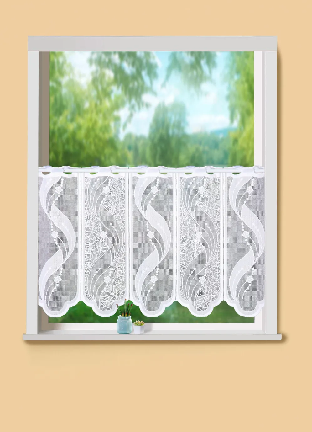 Dieser lichtdurchlässige Kurzstore mit modernem Wellen- Dessin präsentiert sich mit gebogtem Abschluss und ist eine ansprechende Dekoration an Ihrem Fenster! Mit praktischem Stangendurchzug gefertigt.