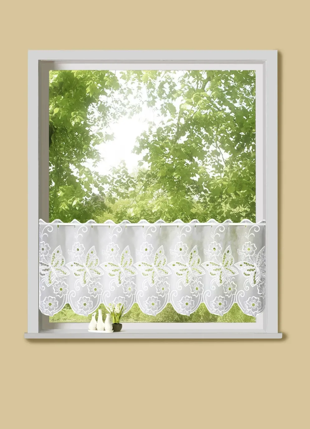 Ein filigranes Schmetterlings-Muster ziert diesen wunderhübschen Kurzstore mit echter Plauener Stickerei. Mit gebogtem Abschluss sowie Stangendurchzug ausgestattet. Die Qualität: 100% Polyester
