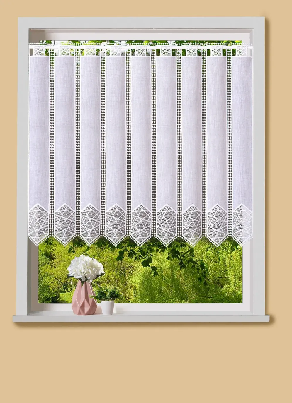 Toller Kurzstore „Grafik“. Mit Stangendurchzug gefertigt. Qualität: Macramé-Spitze, 100% Polyester.