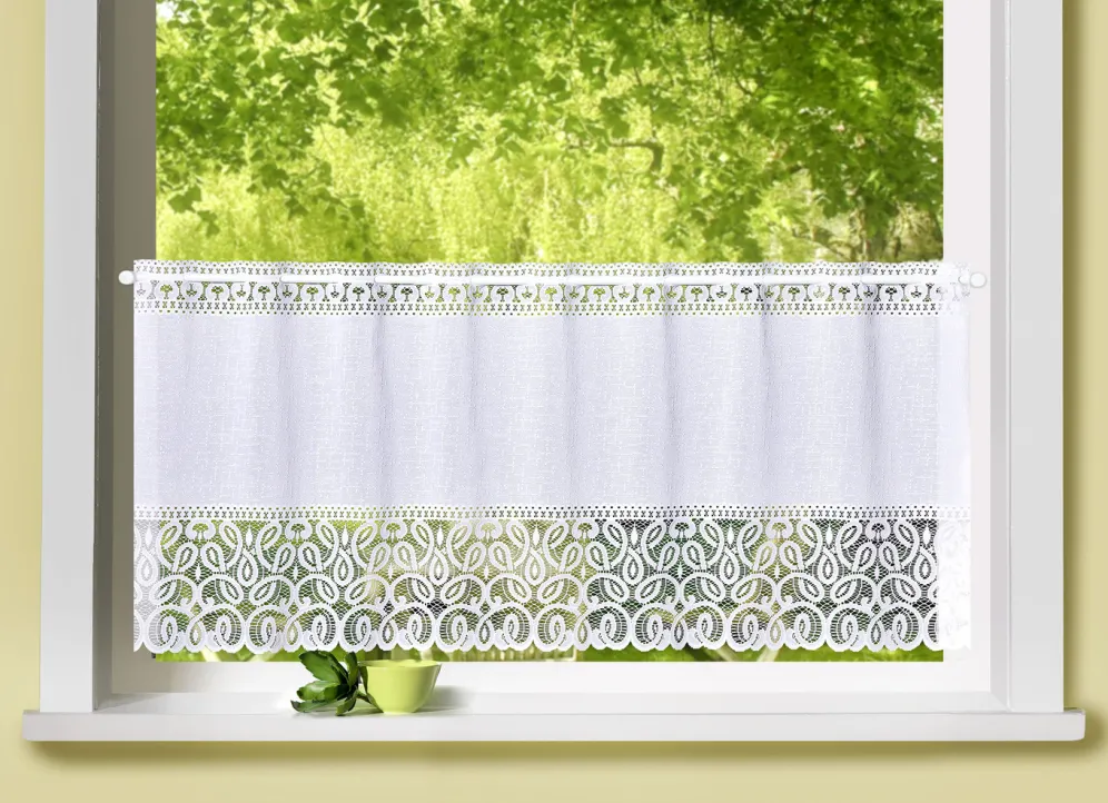 Ein ganz besonders dekorativer Blickfang ist dieser Kurzstore mit Stangendurchzug sowie ausdrucksstarker Musterung und gebogtem Abschluss. Qualität: Jacquard aus 100% Polyester. Nach Öko-Tex Standard 100