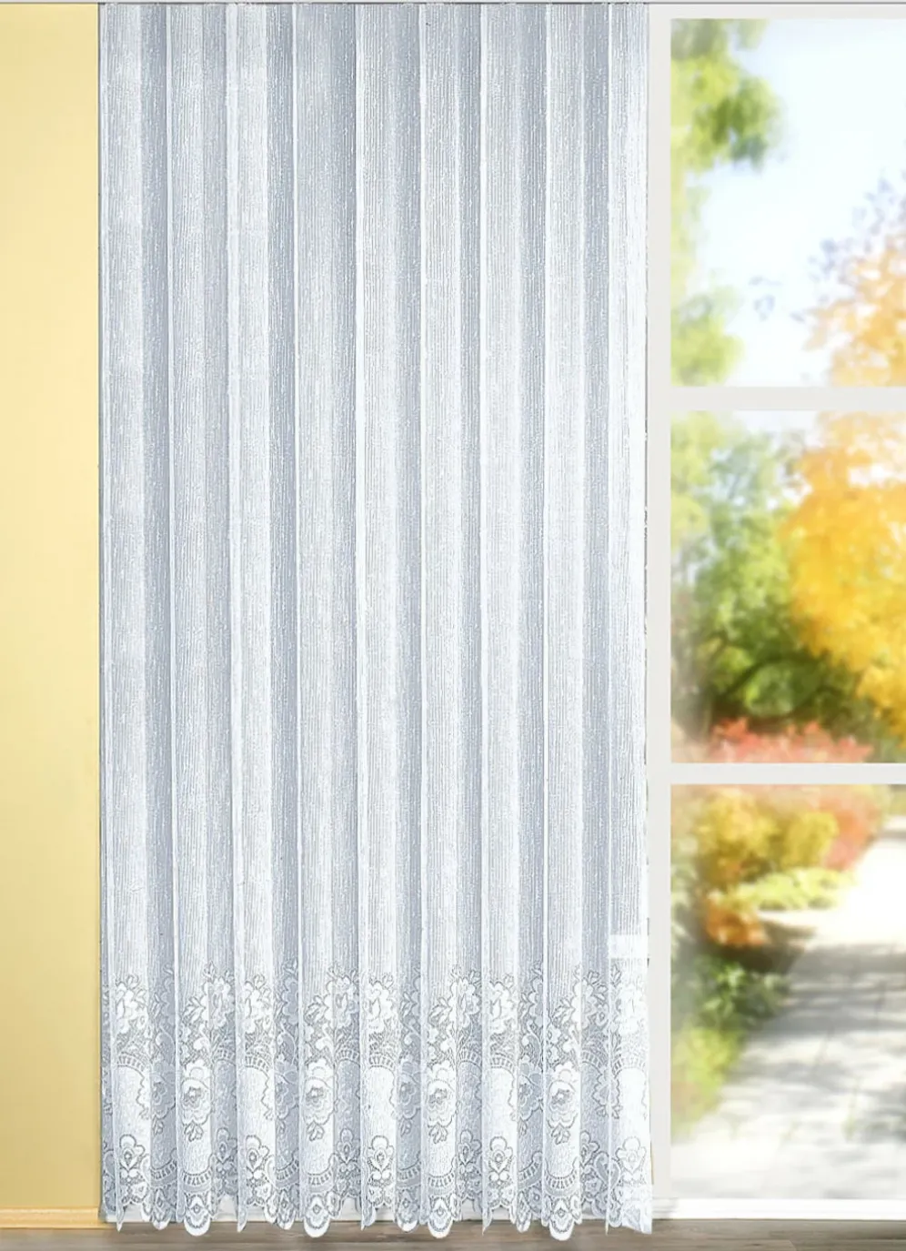 Weißer, dessinierter Langstore, auch für die Balkontür geeignet. Mit Faltenband. Bestellen Sie deshalb die 3-fache Leisten/Deko-Breite. 100% Polyester/„Trevira“. Nach Ökotex-Standard 100