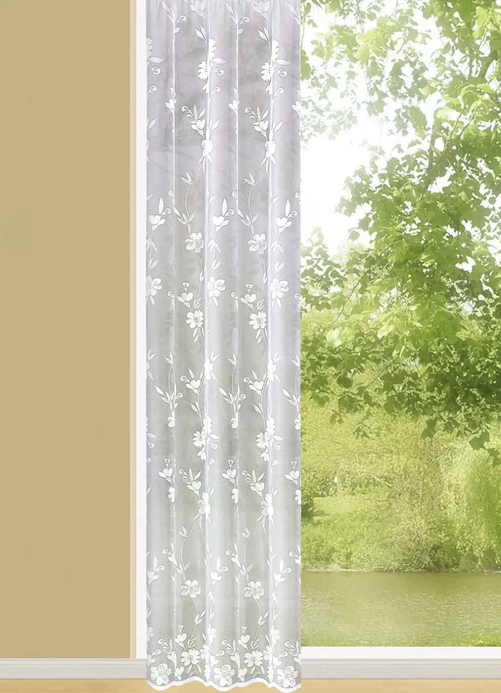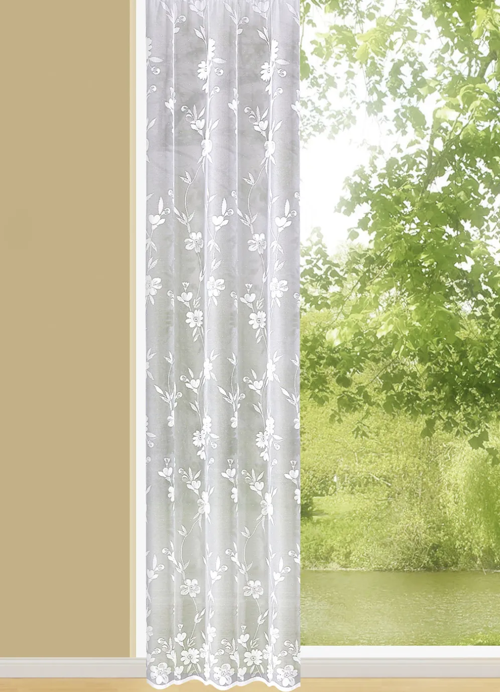 Einen wunderbar blumigen Ausblick beschert Ihnen dieser floral dessinierte Langstore mit Universalschienenband! Unten ausgebogt und seitlich gesäumt. Die Qualität: Jacquard aus 100% Polyester.