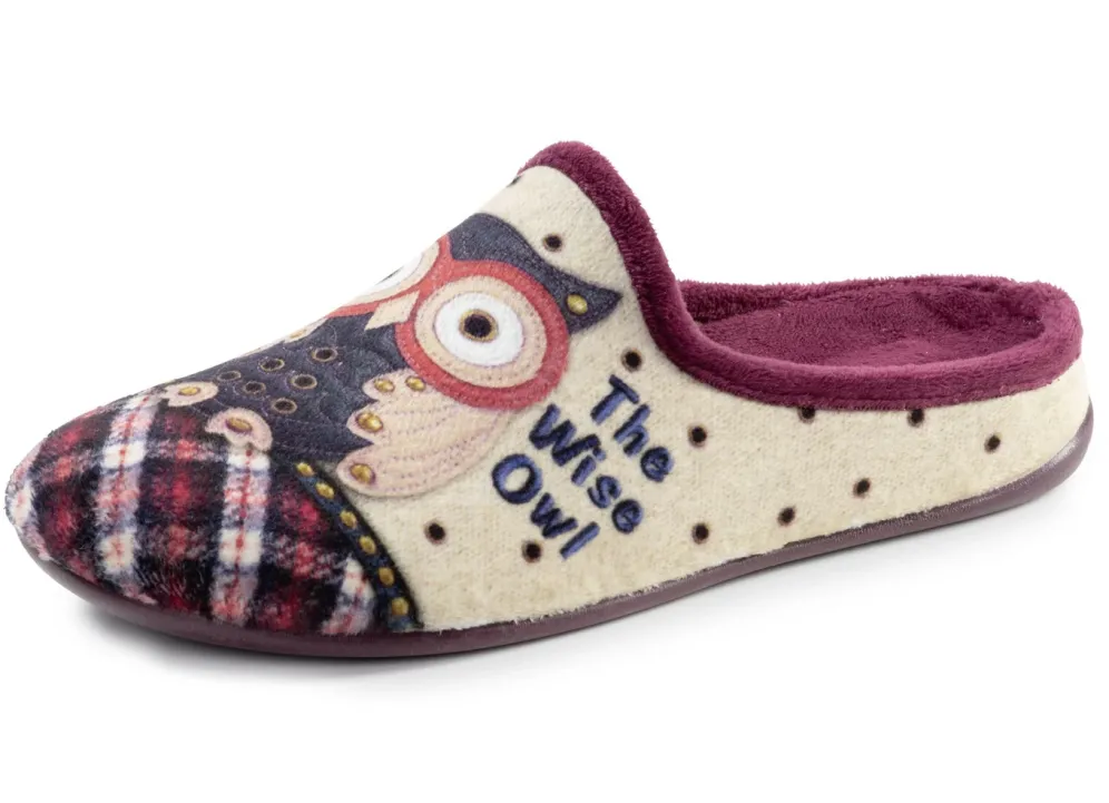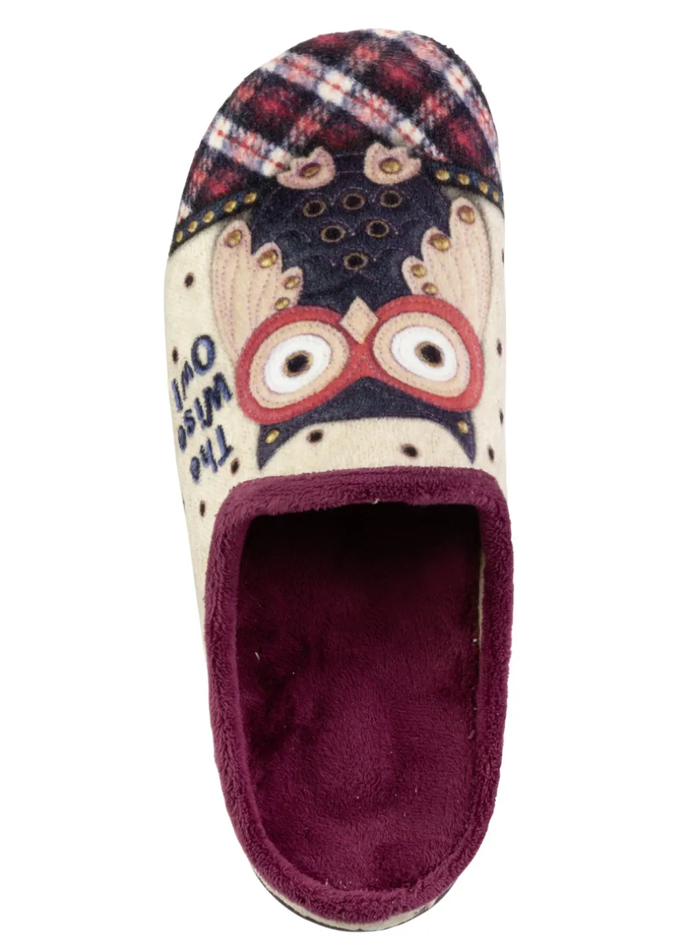 Hausschuhe von „Laurina“, in Ecru-Bunt aus samtigem Textilmaterial mit niedlichem Eulen-Motiv: Weite G, gepolstertes Textilfutter, herausnehmbares Fußbett, flache Gummi-Laufsohle