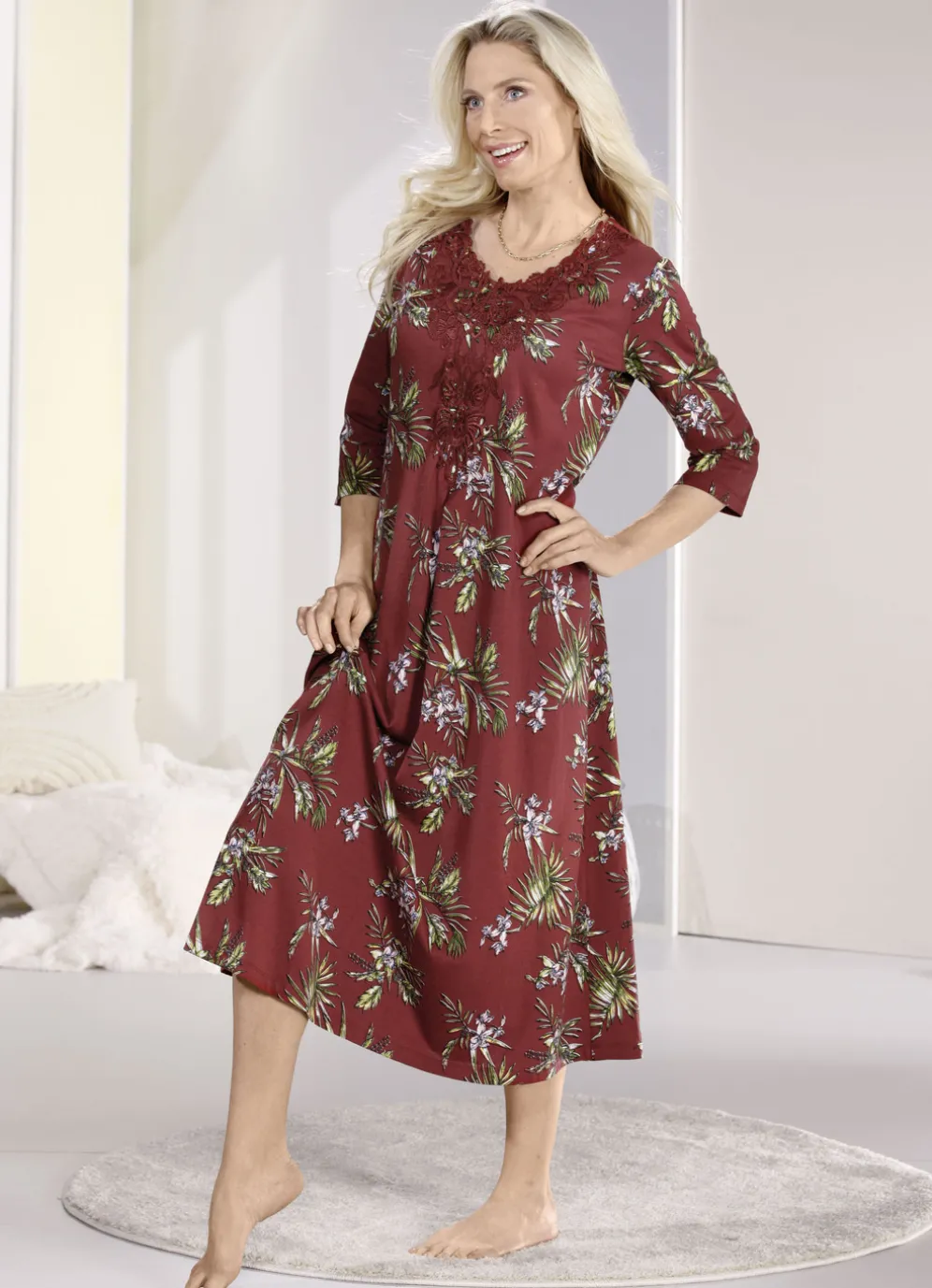 Laurina Nachthemd, knöchellang mit großzügiger Motivspitze in Bordeaux-Bunt und in Größe 36.