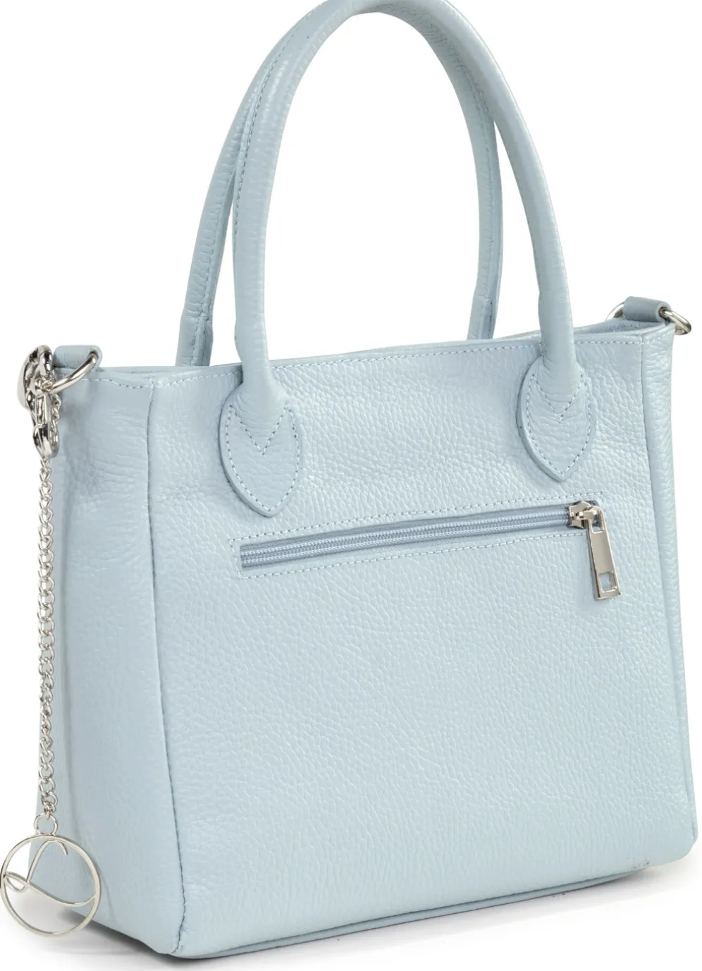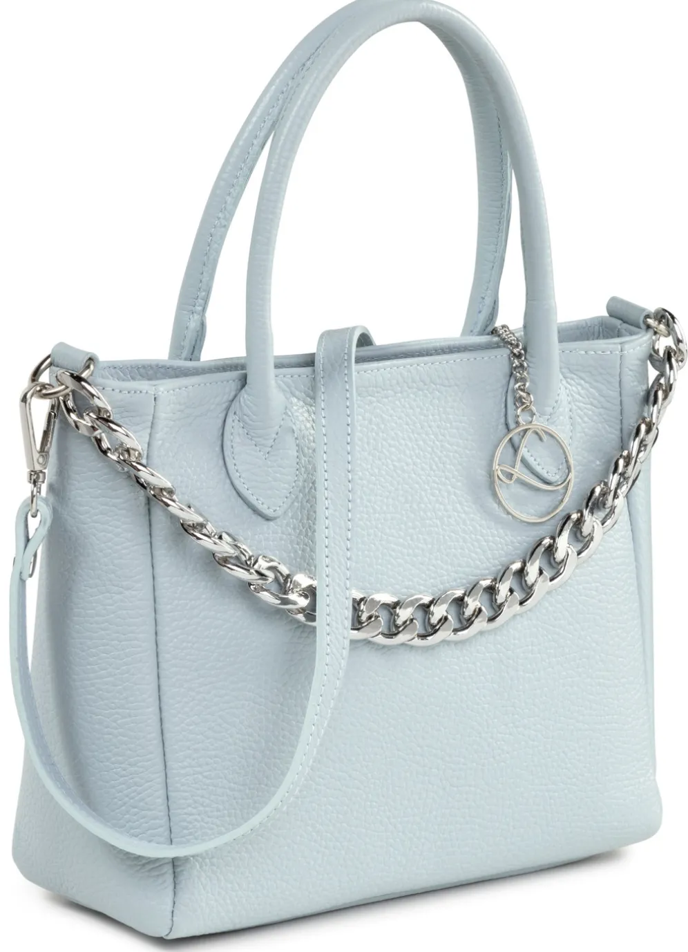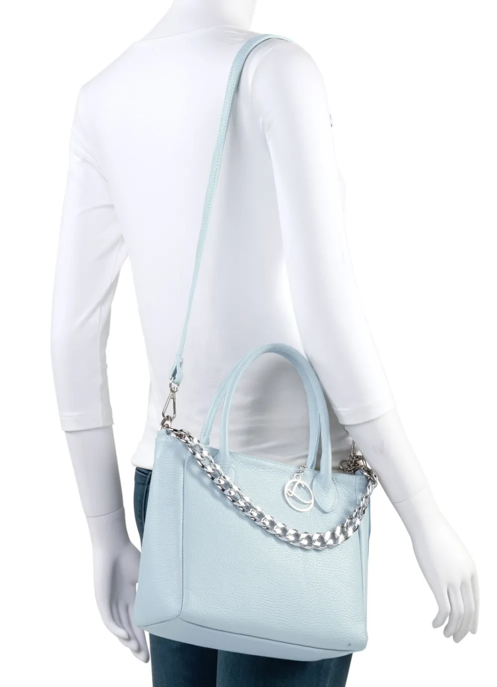 Laurina Tasche aus genarbtem Kalb-Nappaleder mit Zierkette in Hellblau.
