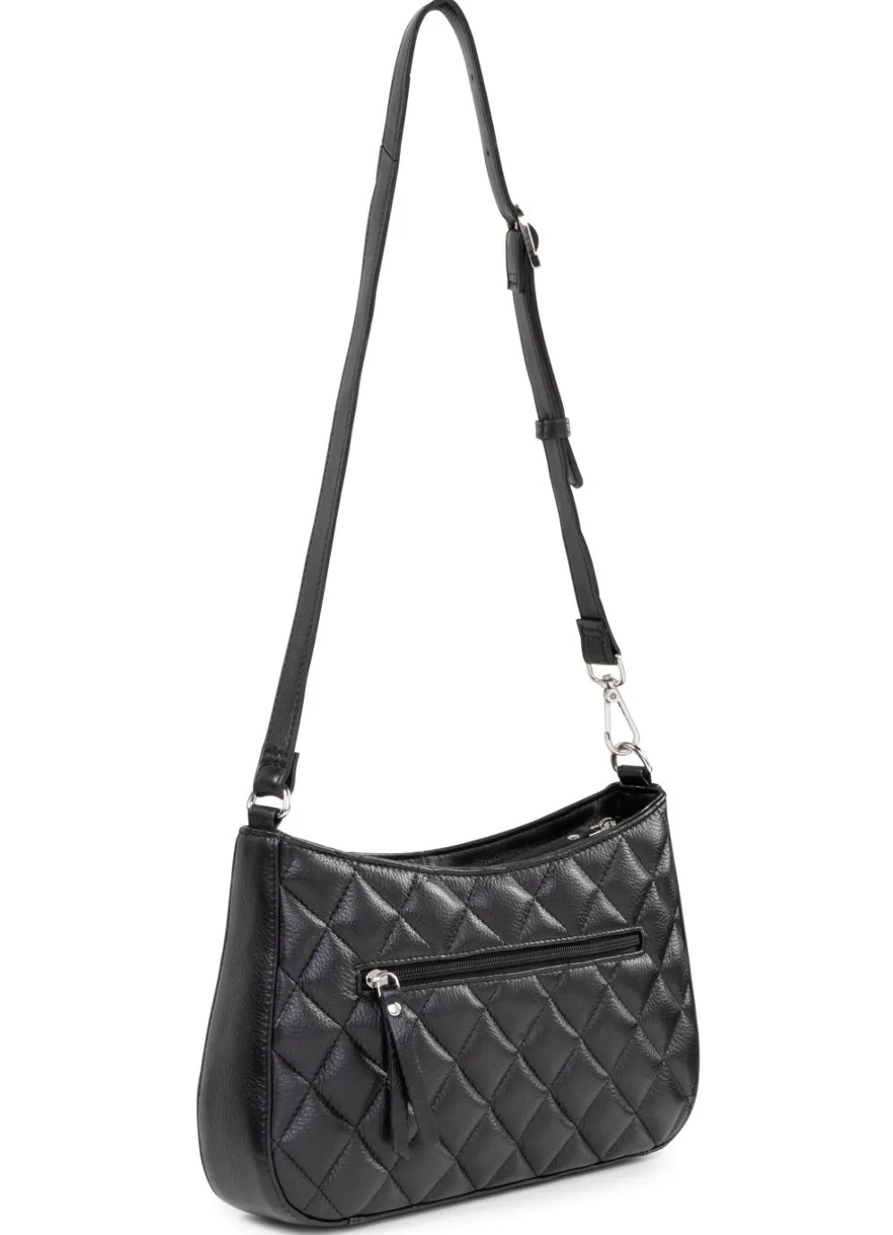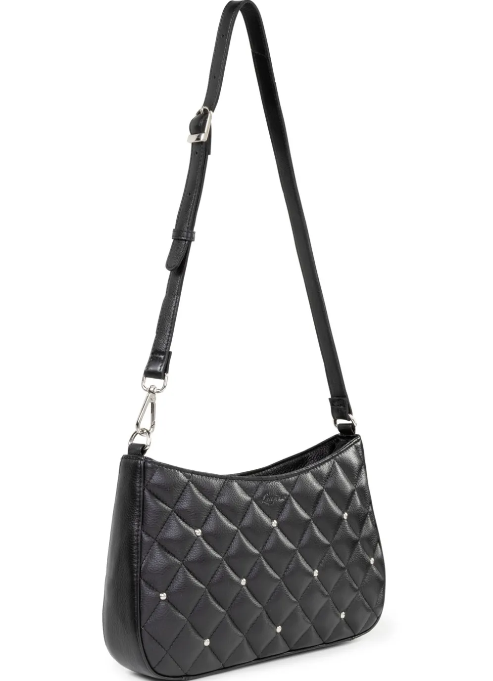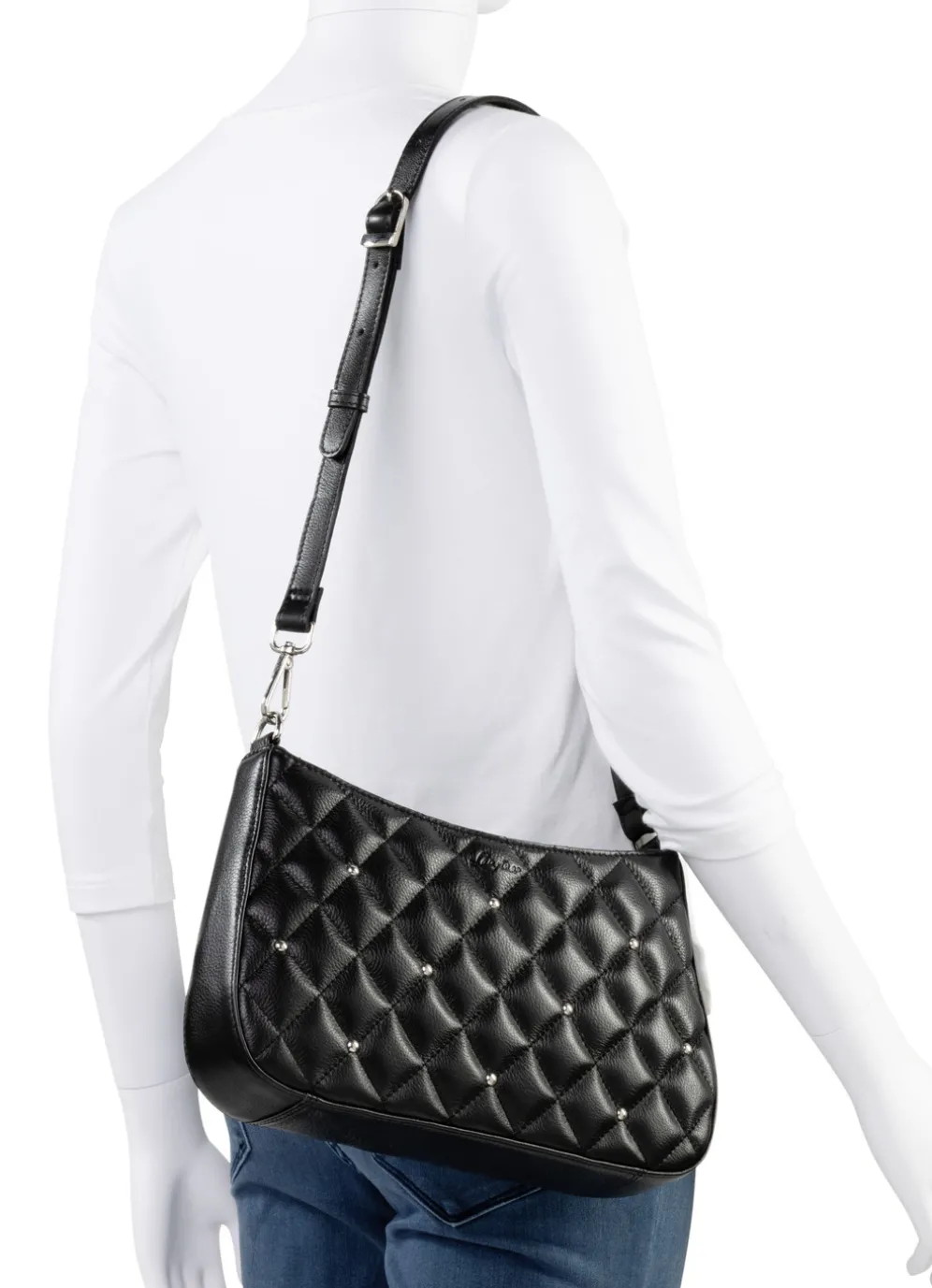 Trendige „Laurina“-Tasche aus genarbtem Vollrind-Nappaleder, mit angesagter Steppung und Ziernieten: Reißverschluss-Hauptfach, diverse Reißverschluss- und Steckfächer, Textilfutter, ein verstellbarer Umhängeriemen ca. 73-95 cm Gr: 30x17x6 cm