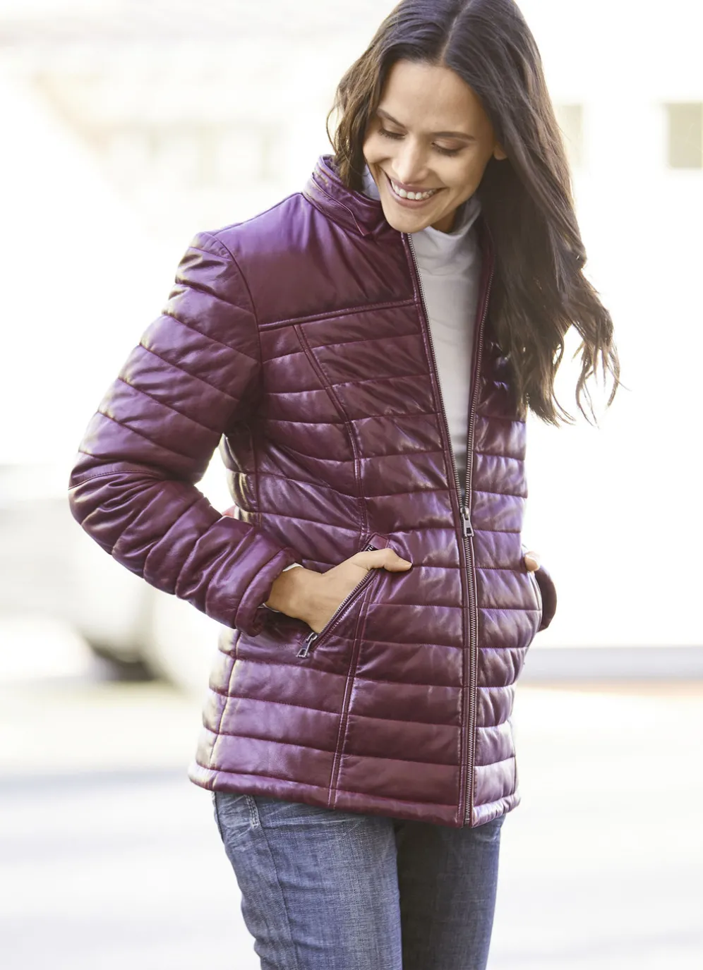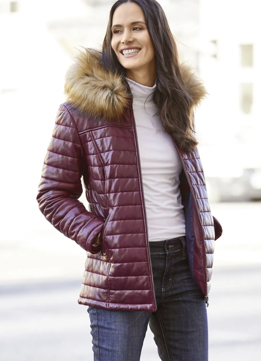 Aus unglaublich weichem Lamm-Nappaleder ist diese zauberhaft schöne Jacke in antik Bordeaux gefertigt: abtrennbare Kapuze mit Webpelzbesatz und Kontrastfutter, Reißverschluss, zwei Reißverschluss-Taschen, Emblem am linken Ärmel sowie zwei Innentaschen.