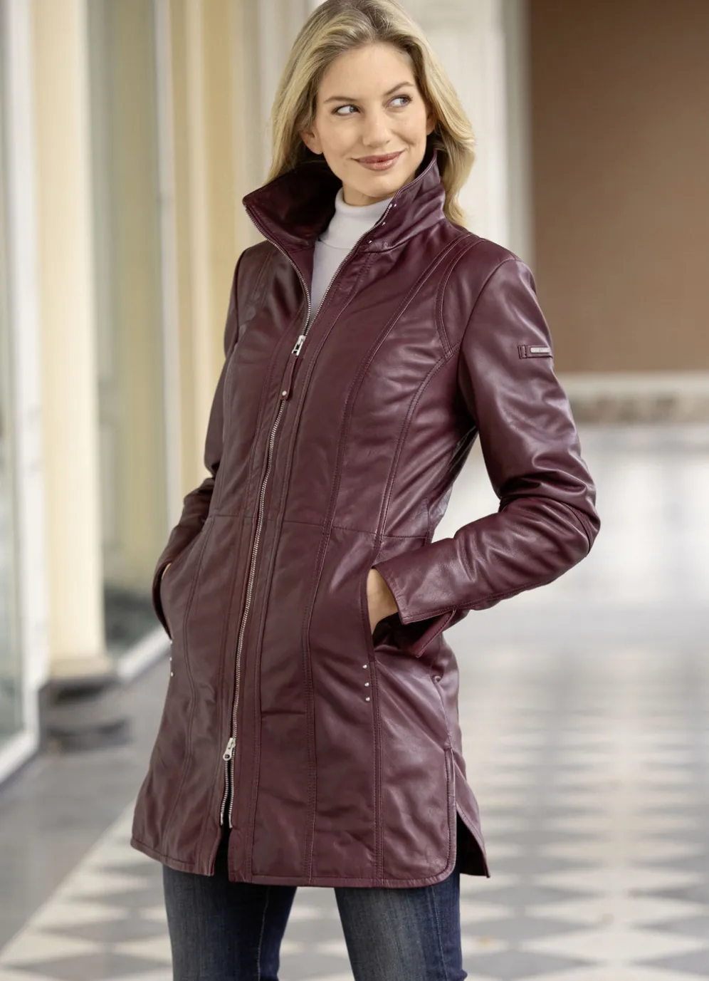 Lederkurzmantel von „Cabrini“ in Bordeaux und in Größe 36.