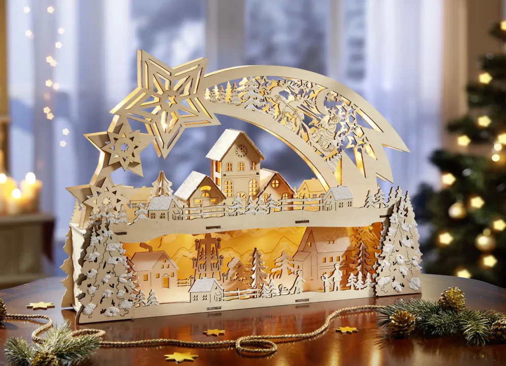 Dieser hübsche Lichterbogen sorgt für eine weihnachtliche Atmosphäre in Ihren Wohnräumen! In 3 Ebenen aufgeteilt zeigt sich im unteren Bereich eine Waldszene mit Häuschen, in der Mitte zeigt sich ein Winterdorf und das Ganze wird von einer Sternschnuppe, auf der der Weihnachtsmann mit seinen Rentieren fliegt, überspannt.