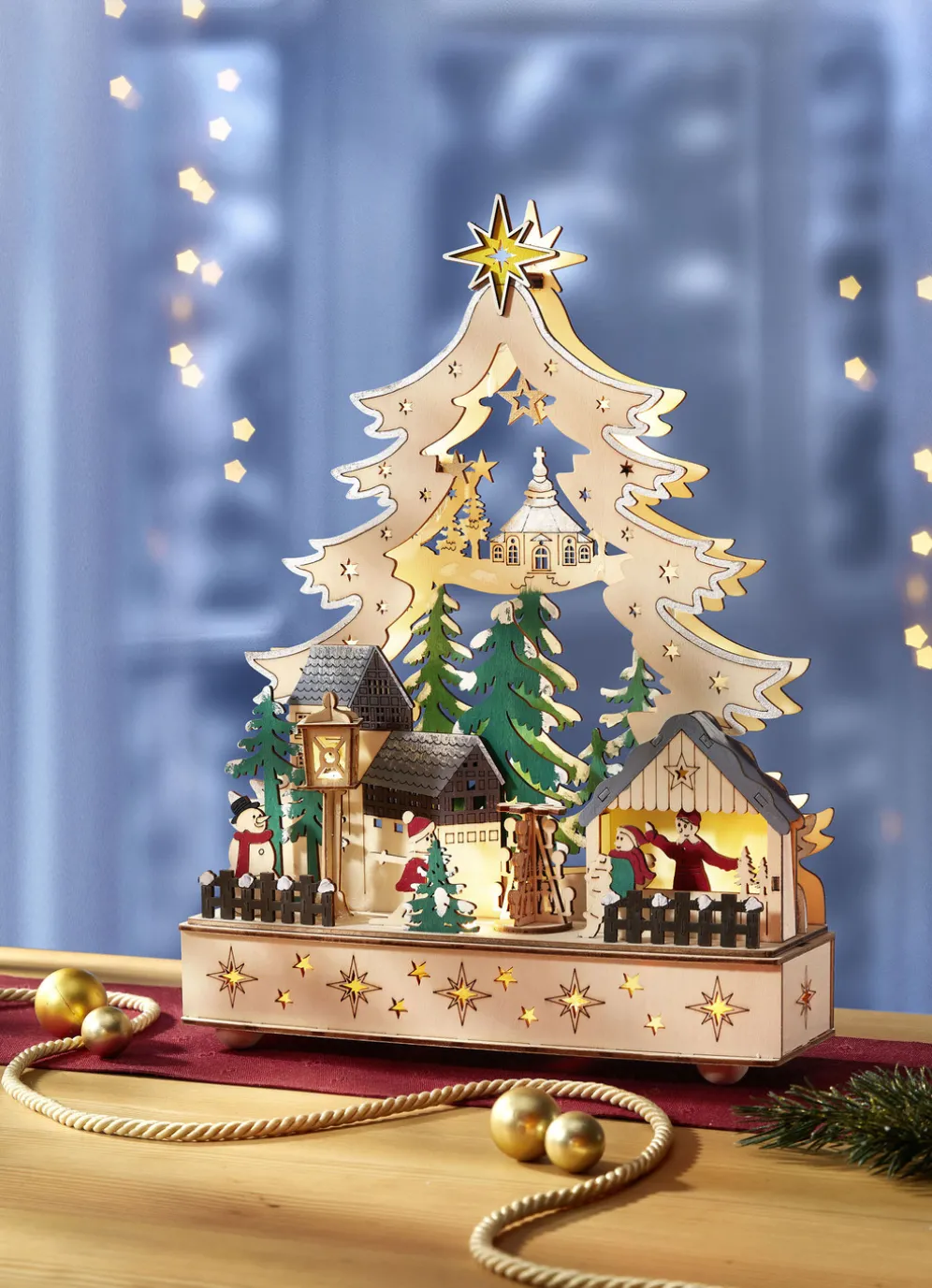 Dieser wunderschöne Lichterbogen in Tannenbaumform zaubert eine tolle Atmosphäre in Ihr Zuhause. Die Szene zeigt ein kleines Winterdorf umgeben von Tannenbäumen, mit Hütten, einem Schneemann und kleinen Männchen. Im Hintergrund ist die Seiffener Kirche zu sehen. Die Beleuchtung, mit 12 warmweißen LEDs bringt die Szene zum Strahlen. Batteriebetrieben mit 2x 1,5 Volt Mignon (nicht im Lieferumfang enthalten). Aus hochwertigem Holz gefertigt. Maße: ca. B25xH32xT8 cm