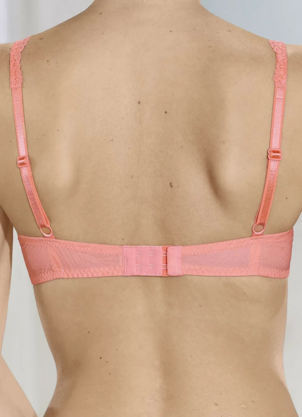 Pfirsichfarbener „LingaDore“-Bügel-BH mit hübschem Jacquard-Dessin, weich gepolsterten, vorgeformten Cups sowie elastischer Spitze in der Büstenmitte und an den verstellbaren Stretchträgern.