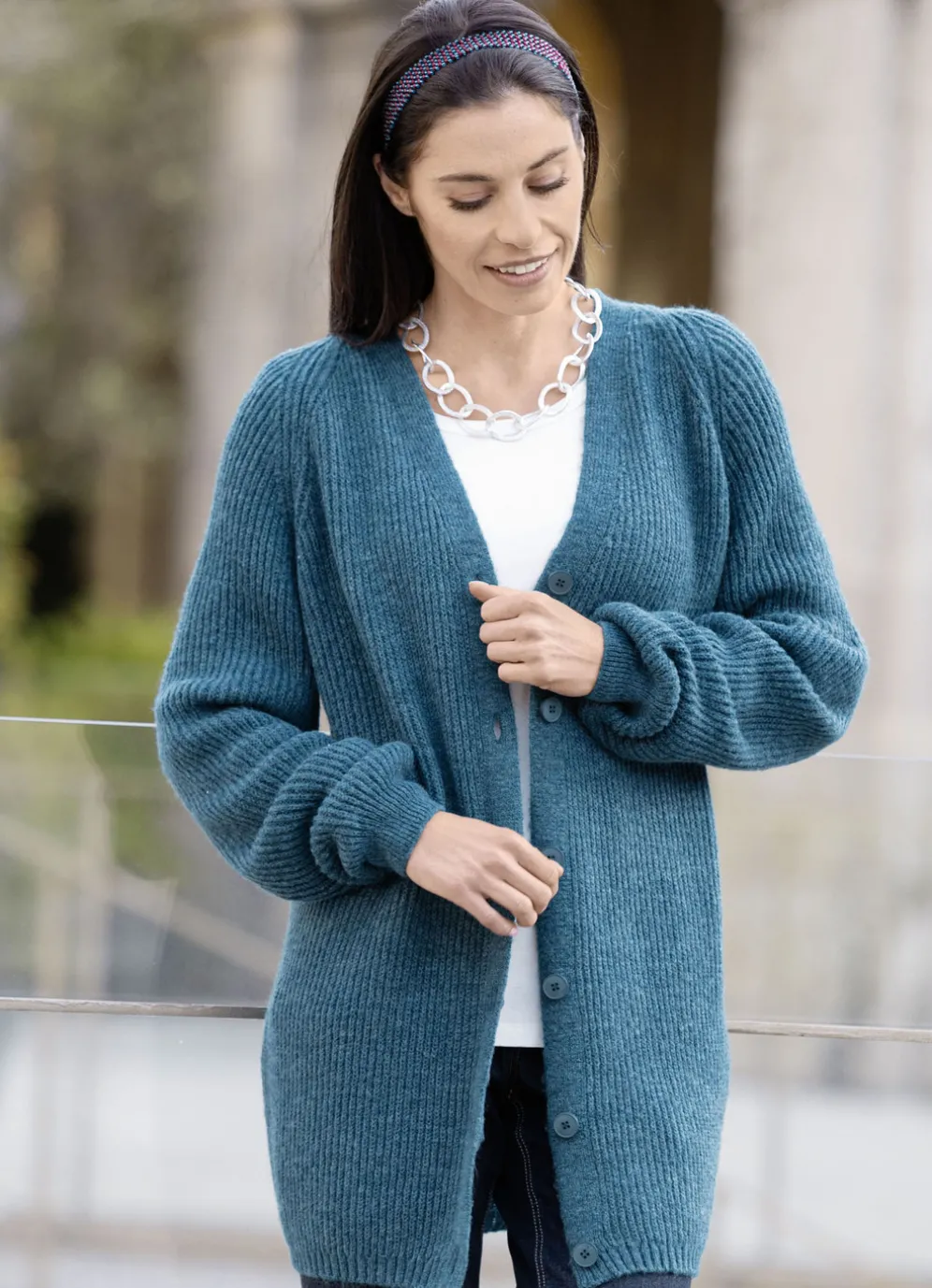 Der absolute Kuschelfavorit ist diese durchgeknöpfte, petrol melierte Long-Strickjacke mit V-Ausschnitt sowie Rippenabschlüssen an den langen Raglanärmeln und am Saum.