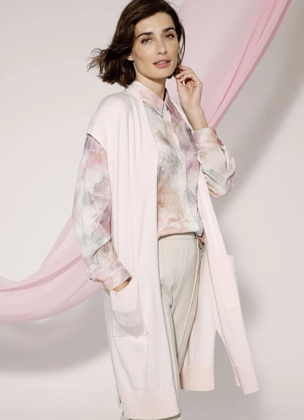 Verschlusslose, roséfarbene Long-Strickweste mit überschnittenen Schultern, gerippten Armausschnitten, Saum- sowie Taschenabschlüssen, 2 aufgesetzten Taschen und Seitenschlitzen.
