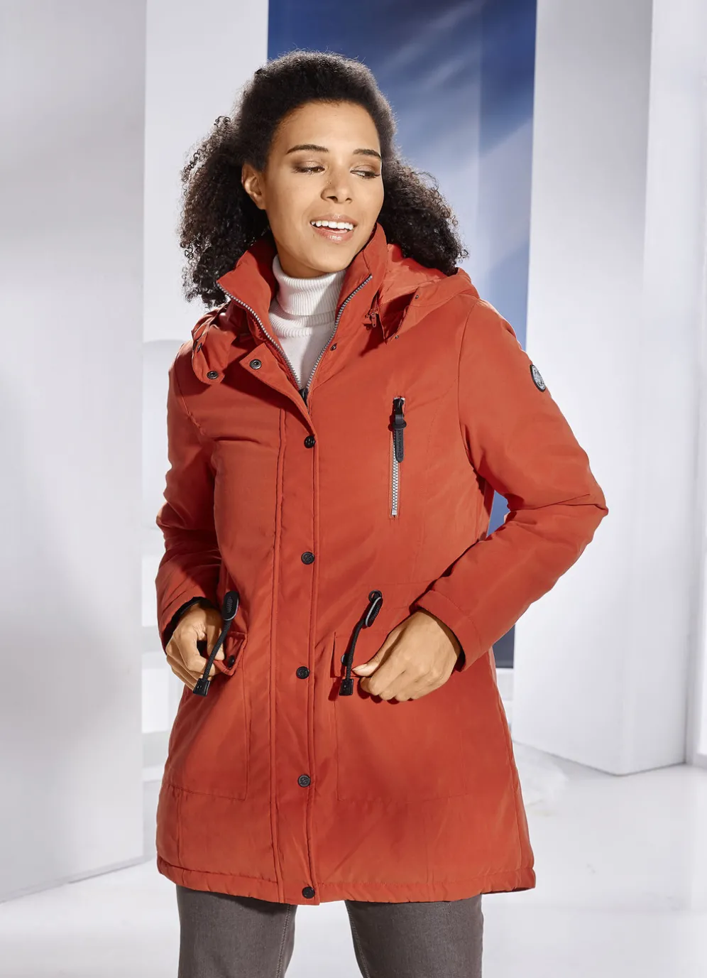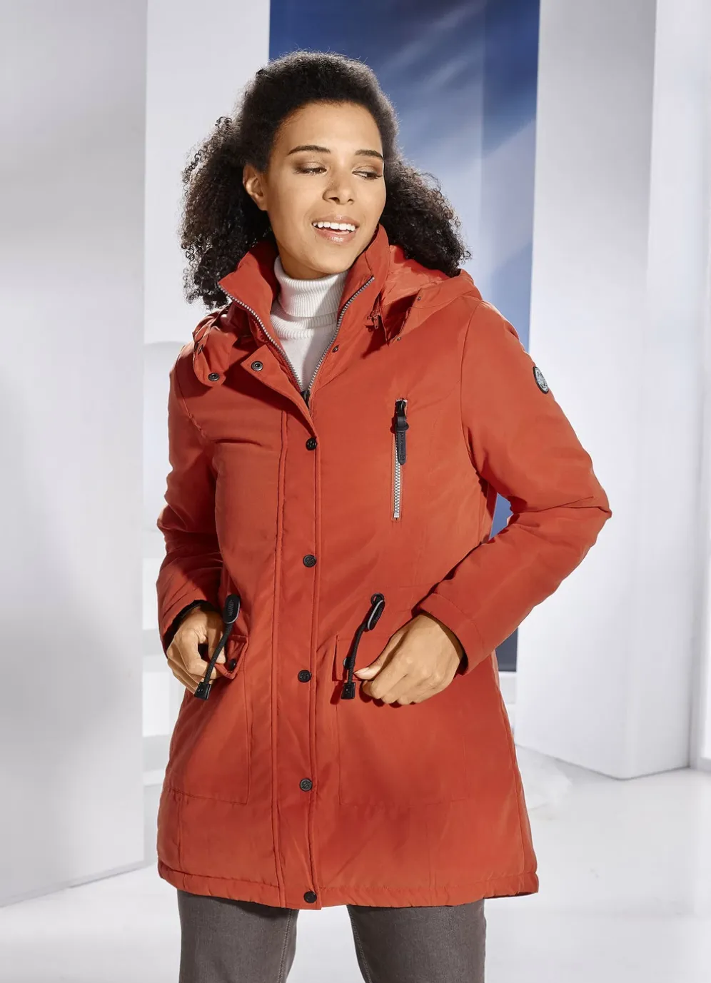 Ein idealer Begleiter ist diese Longjacke in Kürbis: durch Riegel und Schnalle größenverstellbare, abnehmbare Kapuze mit Riegel und Druckern, durch 2-Wege-Reißverschluss unter der Druckerleiste hoch schließbarer Stehkragen, Brusttasche mit Reißverschluss, Durchzugsband und Stopper in der Taille, aufgesetzte Taschen mit Patte und Druckern, umschlagbare Ärmel, eine Innentasche sowie verlängertes, abgerundetes Rückteil. Länge ca. 87 cm.