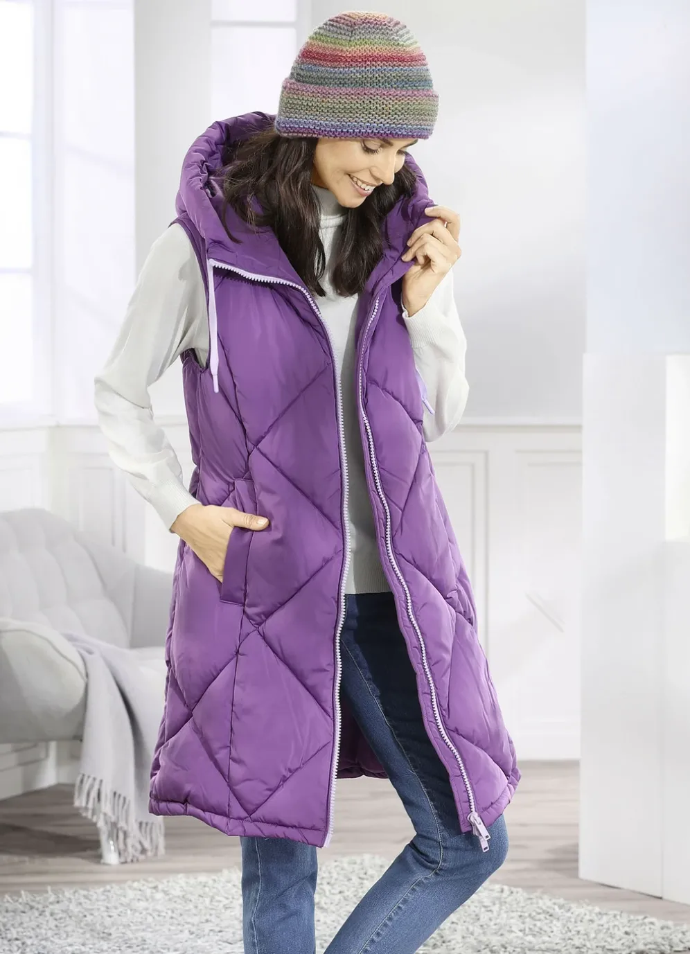 Amethystfarbene Longweste: feste Kapuze mit Bindeband, 2-Wege-Reißverschluss, Schubtaschen mit breiter Blende, eine Innentasche sowie leicht verlängertes, abgerundetes Rückteil. Länge ca. 100 cm. Die Qualität: Micro-Popeline und Watte jeweils aus 100% Polyester. Waschbar Longweste: feste Kapuze mit Bindeband, 2-Wege-Reißverschluss, Schubtaschen mit breiter Blende, eine Innentasche sowie leicht verlängertes, abgerundetes Rückteil. Länge ca. 100 cm.