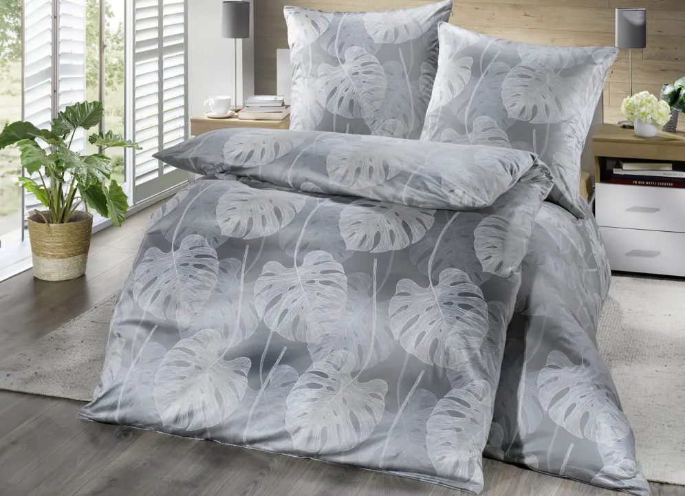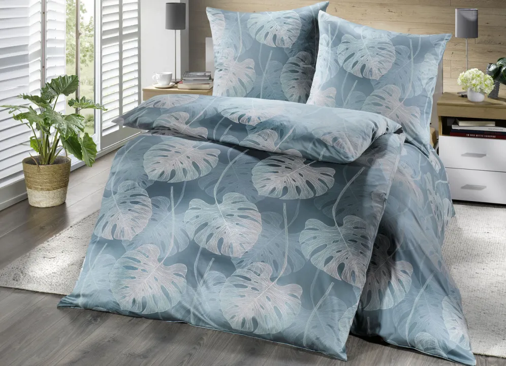 Das tropische Philodendron-Blattdessin verleiht der ansprechenden Bettwäsche-Garnitur von Estella eine besonders schöne und frische Optik und wird zu einem Blickfang in Ihrem Schlafzimmer. Mit Reißverschluss gearbeitet. Die Qualität: Mako-Satin aus 100% supergekämmter, mercerisierter Baumwolle. Waschbar bis 60 °C und für Trockner geeignet