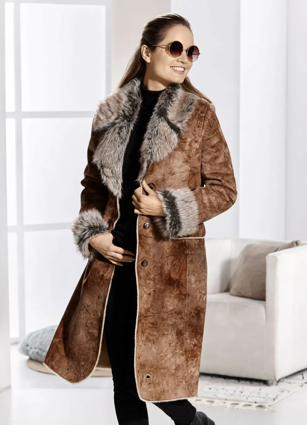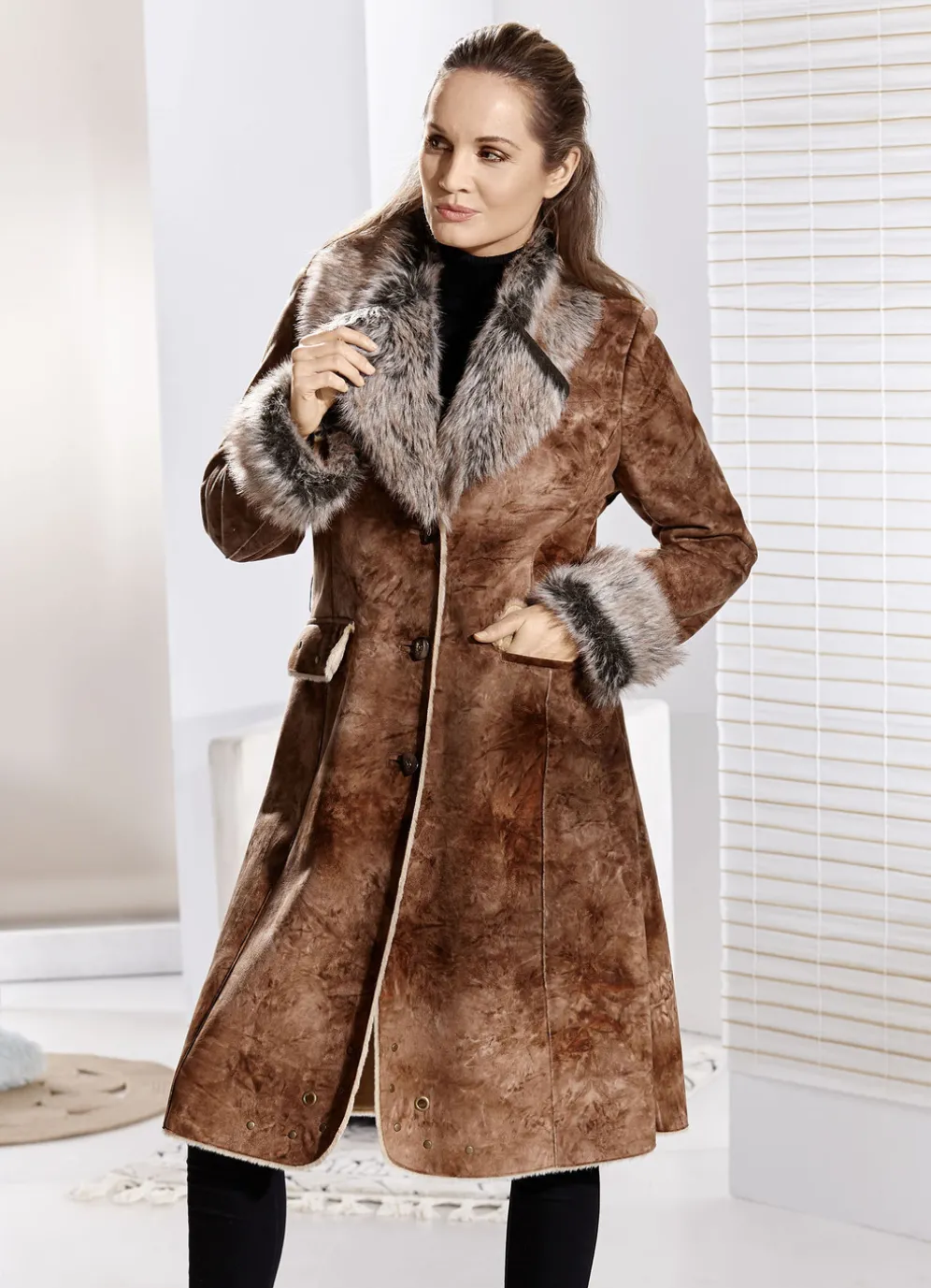 - Kunstpelz-Besatz an Kragen und Ärmelabschlüssen