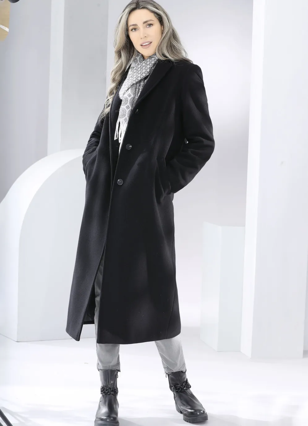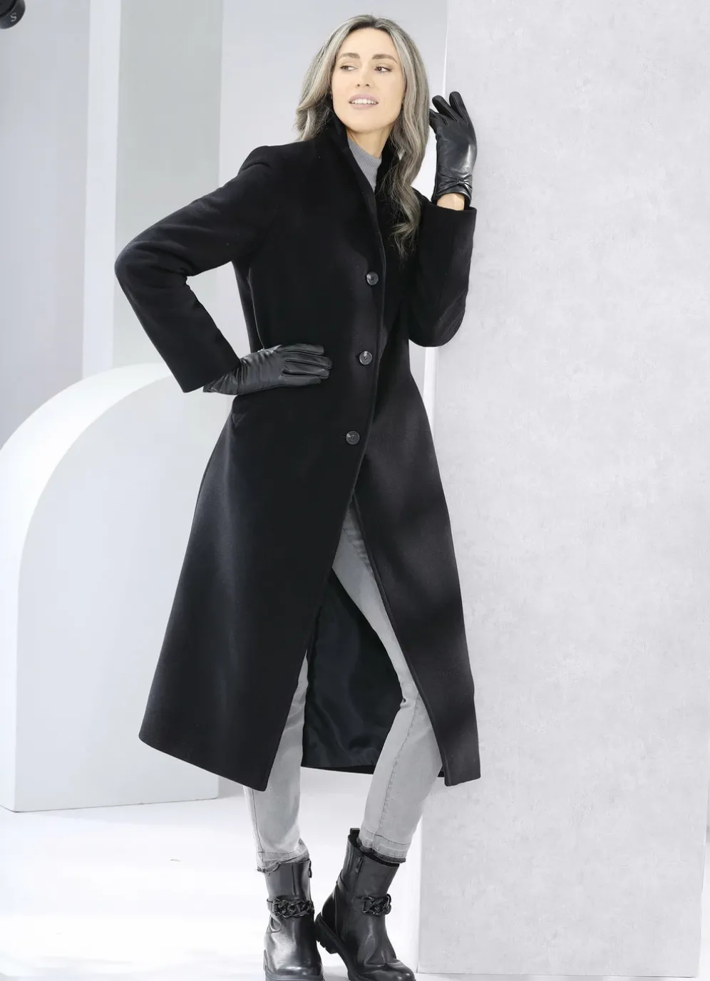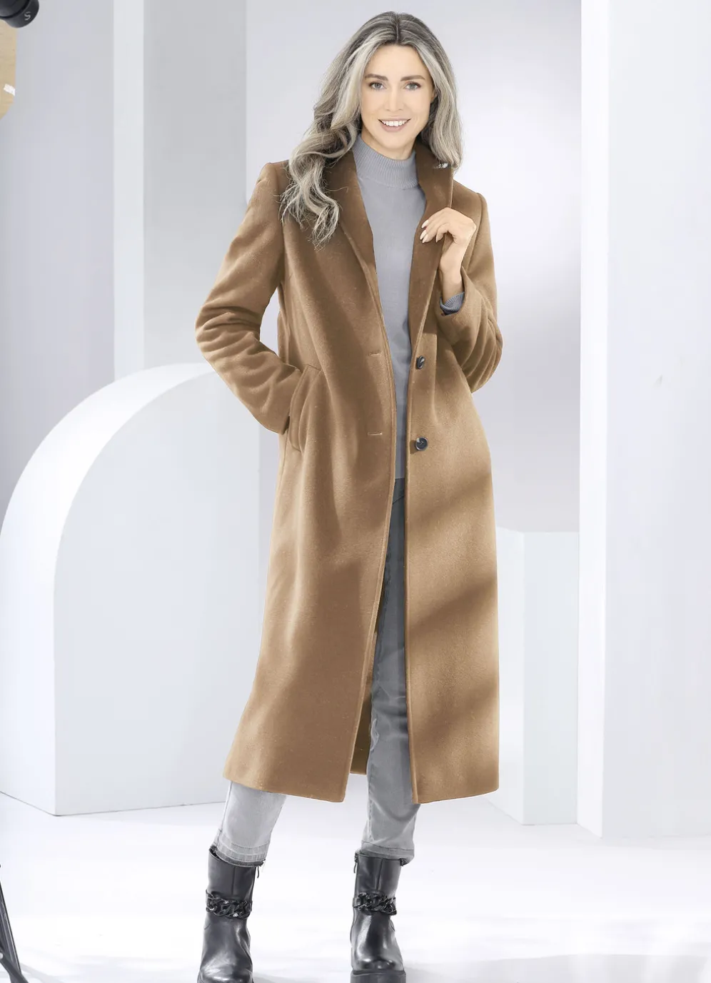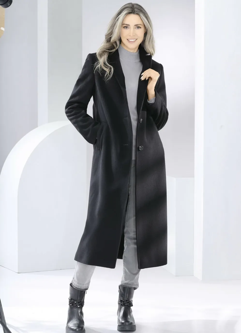 Stilsicherer Mantel mit Reverskragen, Knopfleiste, Schubtaschen mit Blende sowie verdecktem Gehschlitz. Länge ca. 120 cm.