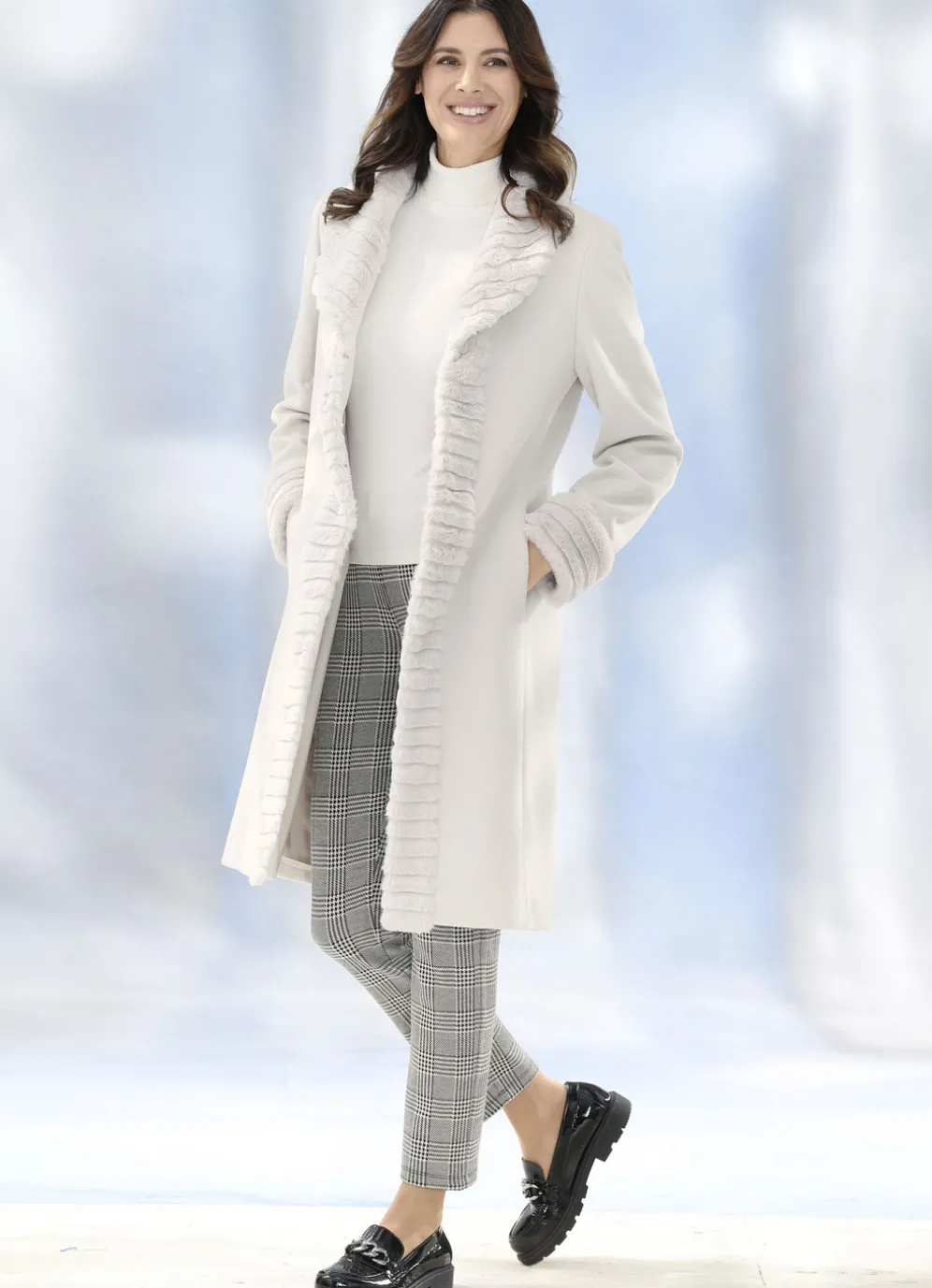 Ein perfekter Begleiter ist dieser Mantel in Creme mit Kunstpelz-Besatz am Kragen, entlang der Verschlussleiste mit Häkchen und an den Ärmelabschlüssen sowie Nahttaschen. Länge ca. 103 cm.