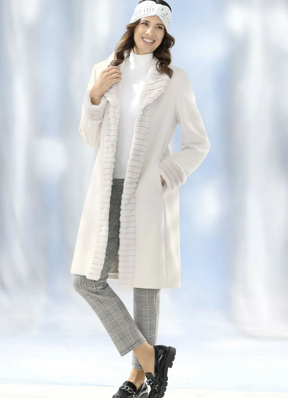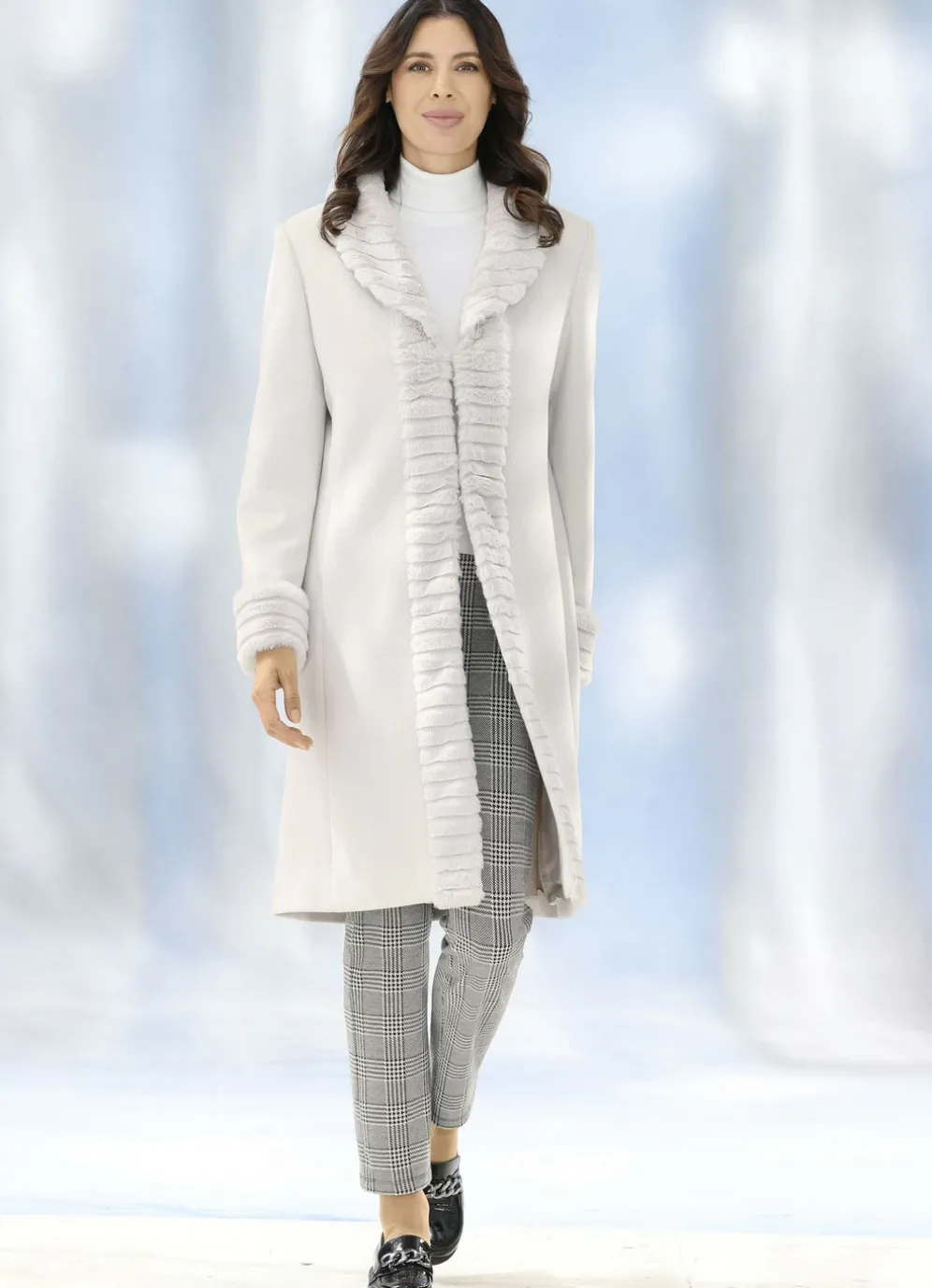 - Kunstpelz-Besatz am Kragen, entlang der Verschlussleiste und an den Ärmelabschlüssen