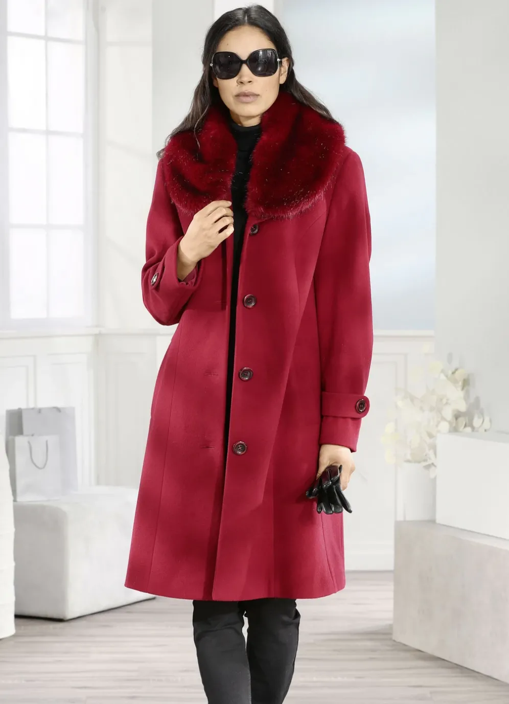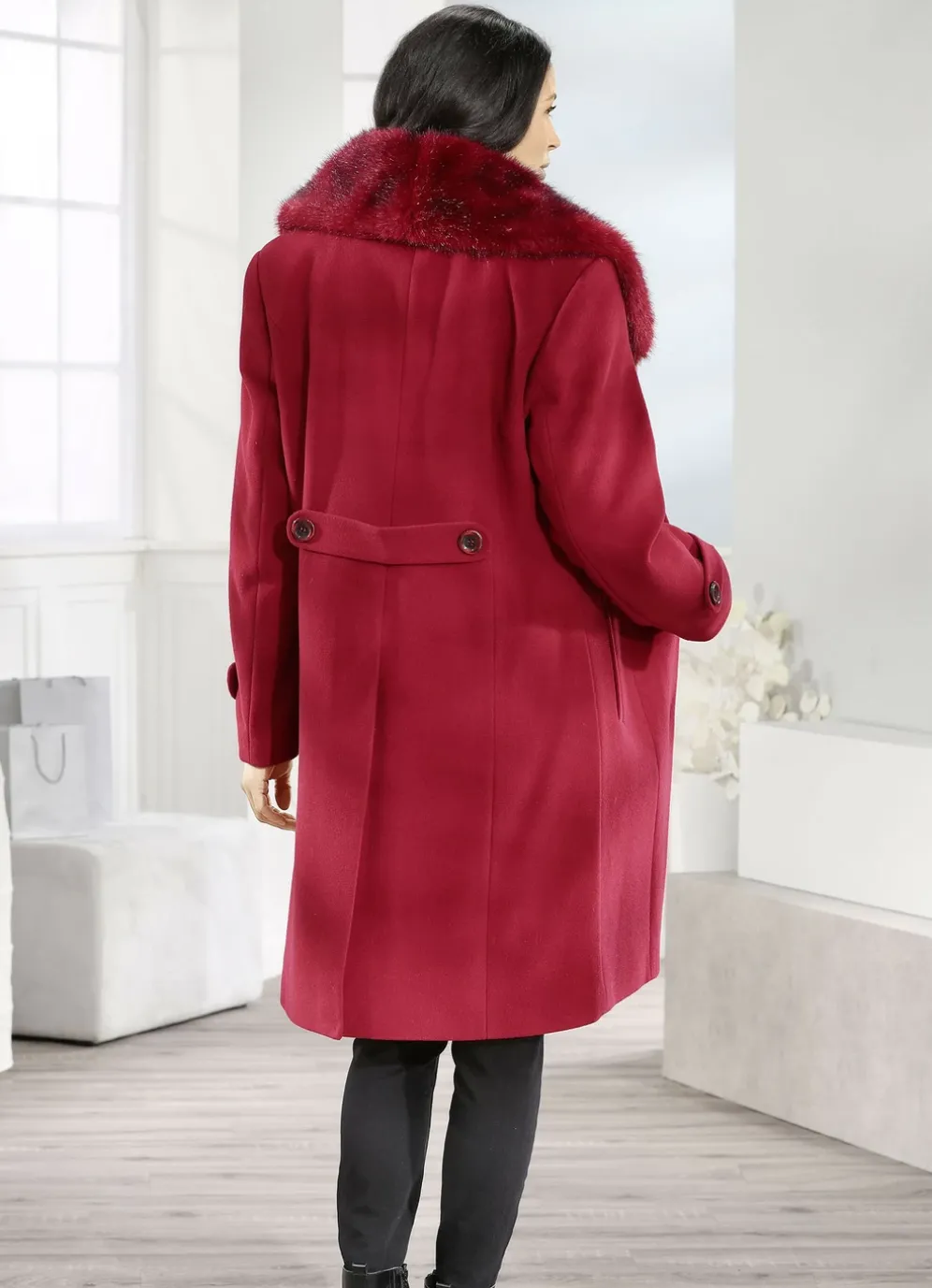 Superschick präsentiert sich dieser karminrote Mantel mit abnehmbarem Kunstpelz-Besatz am Kragen, Knopfleiste, Blende an den Schubtaschen, Riegel und Zierknopf an den Ärmelabschlüssen, Taillenriegel im Rückteil sowie verdecktem Gehschlitz. Länge ca. 102 cm.
