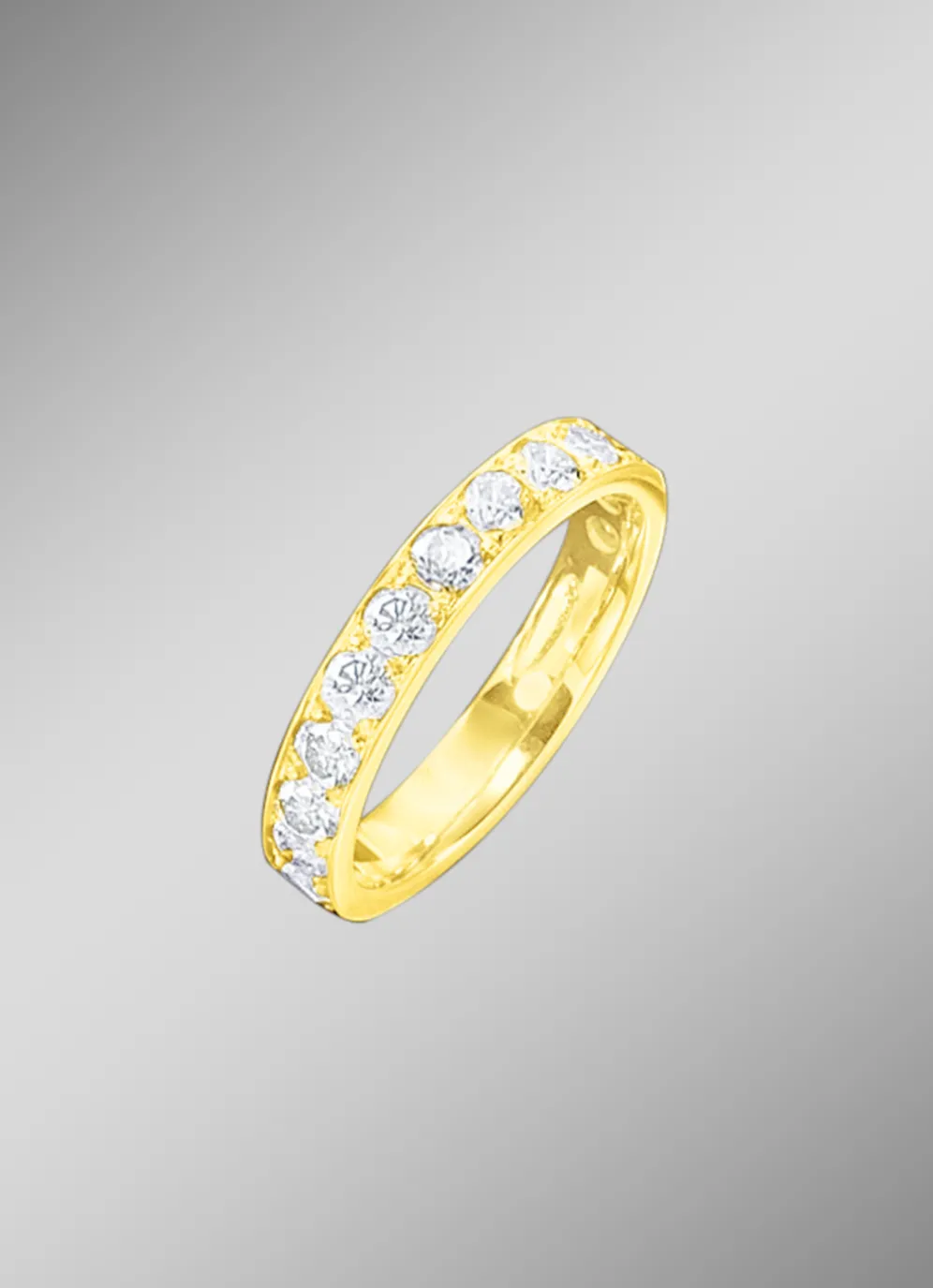 Die streng nebeneinander angeordneten champagnerfarbenen Brillanten entfalten zusammen eine ganz eigene Dynamik und geben dem Ring einen ungewöhnlich intensiven Glanz. Der vollmassive Damenring mit einer 4 mm breiten Ringschiene ist in verschiedenen Varianten erhältlich: