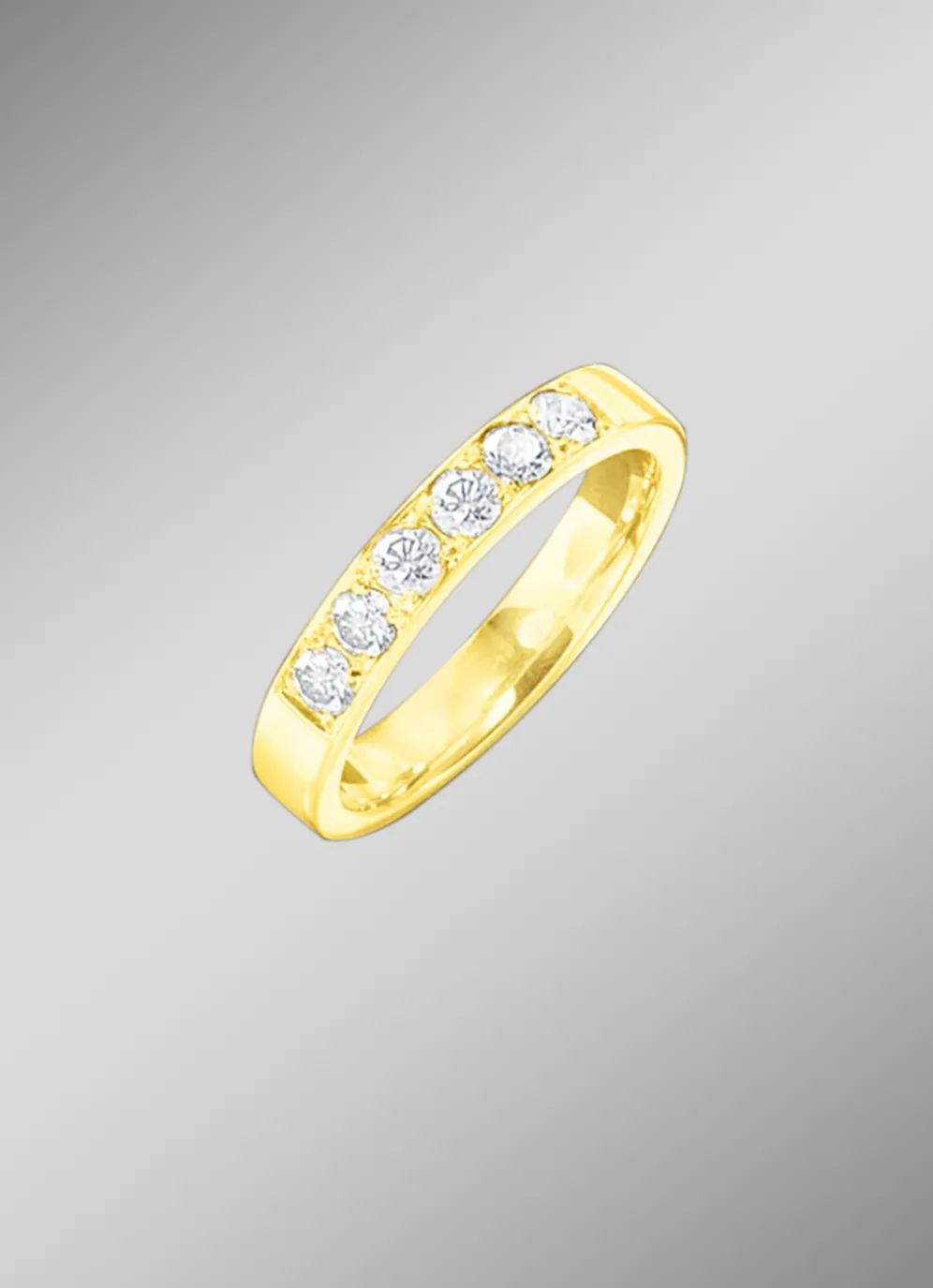 Erleben Sie diesen Ring in seinem Glanz und lassen Sie sich von seinem eleganten Charme verzaubern. Die Basis des edlen Designs ist der warme Glanz des 585-er Gelbgoldes. Die Oberflächenstruktur und die puristische Kreisform bilden den dezenten Gegenpol zur funkelnden Brillant-Reihe in der Mitte des Rings.