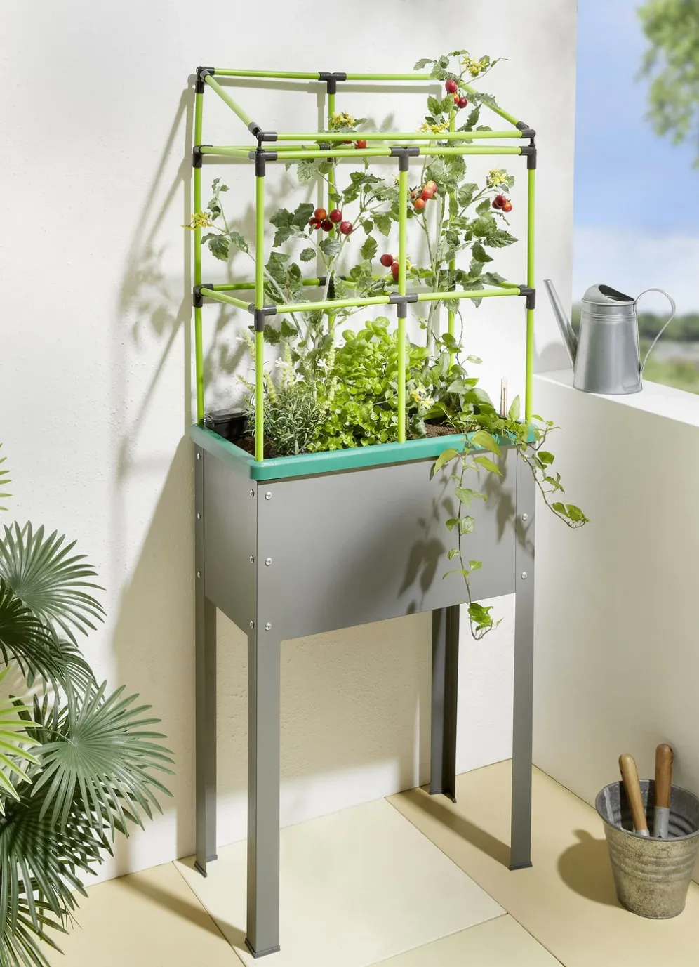 Sollten die grünen Mitbewohner ranken und klettern – kein Problem! Das dazugehörige, passende Rankgitter ist gleich montiert. Kübelvolumen 43 Liter. Hochbeet aus Metall, Rankgitter aus Polypropylen. Mit Aufbau-Anleitung. Maße: B62xH137xT33 cm; Höhe mit Rankgitter 161 cm