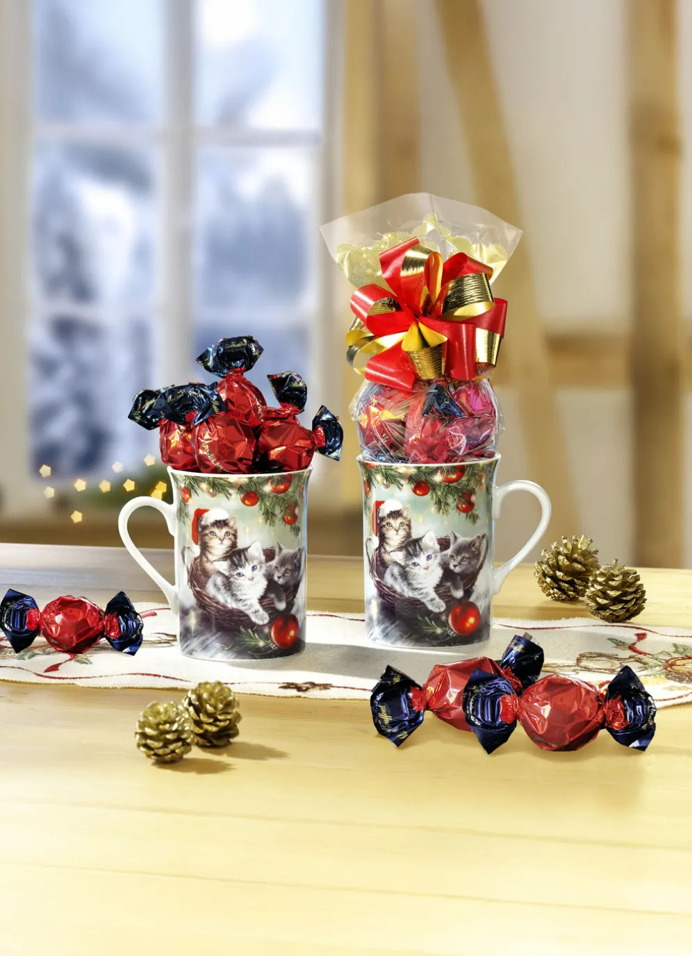 Genießen Sie zu Ihrem Kaffee, Tee oder Glühwein die feinen Pralinenkugeln aus Milchschokolade mit Haselnusscreme-Füllung. Aus den Porzellantassen mit dem wahrlich goldigen Katzenmotiv schmeckt alles gleich viel besser.