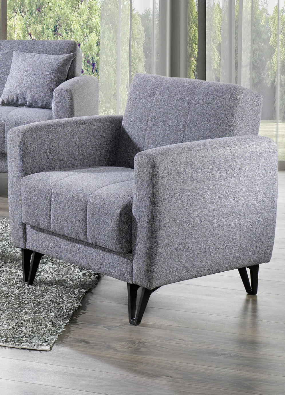 Moderne Polstermöbel auf stabilem Holzgrundgestell mit Nosagunterfederung und Federkern in den Sitz- und Rückenflächen. Bezug aus Webstoff (80% Polypropylen, 20% Polyester). Rückseiten mit Originalstoff bezogen, daher frei im Raum aufstellbar. Alle Elemente mit Kippfunktion. Auf schwarzen Kunststofffüßen. Maße: Höhe je 85 cm, Tiefe 83 cm, Sitzhöhe 49 cm, Sitztiefe je 54 cm. Mit Aufbau-Anleitung zur Endmontage
