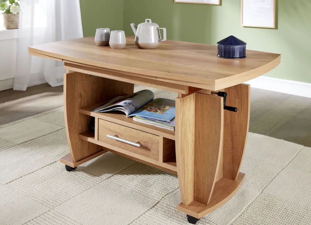 Moderner Couchtisch auf Rollen in der Ausführung Feste Platte und in Wildeiche.