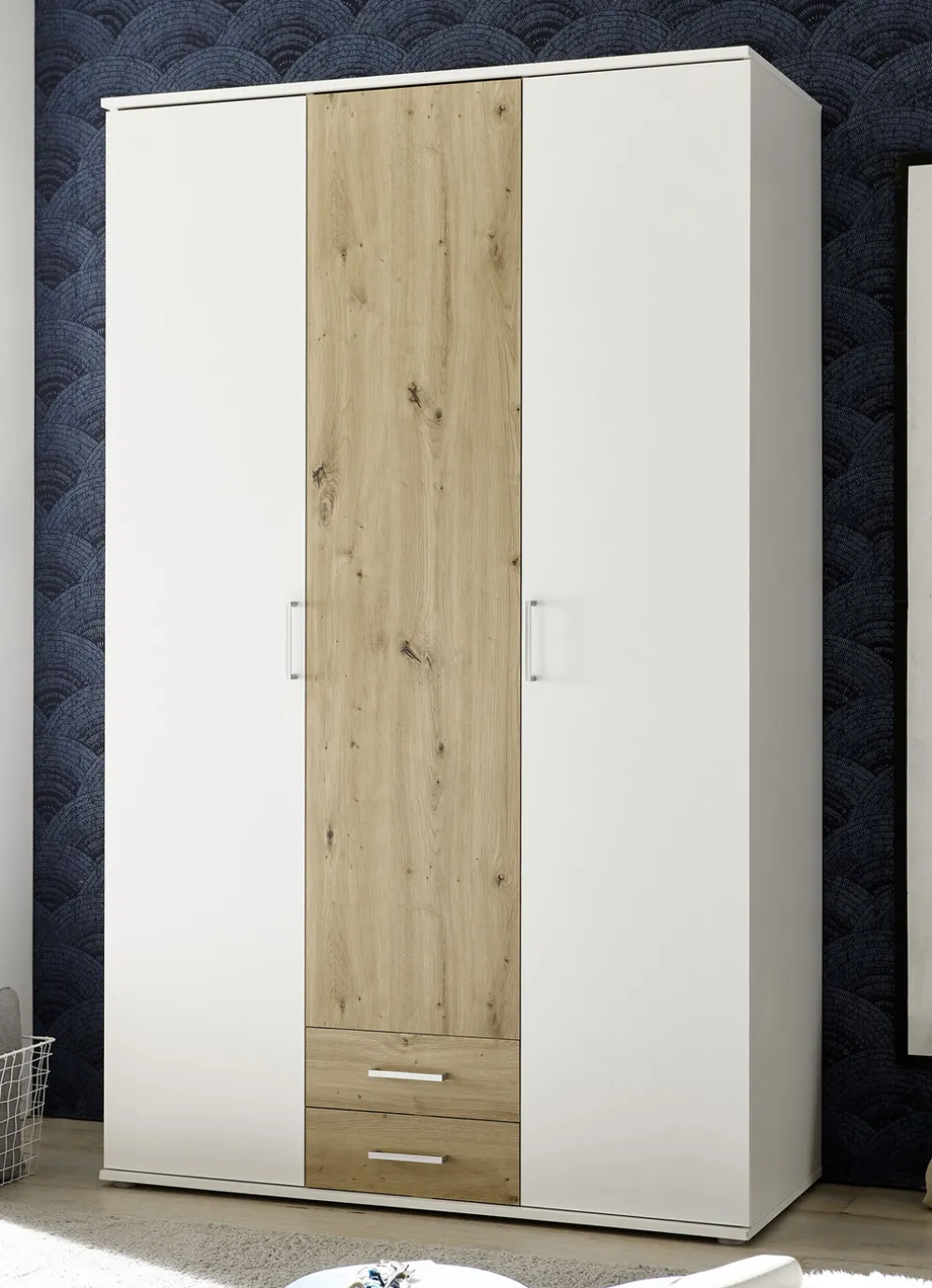 Unsere modernen Kleiderschränke sind die perfekte Aufbewahrungslösung für Ihr Schlafzimmer. Ihre 3- oder 4-türigen Designs in der modernen Farbkombination weiß-eiche sind geräumig und verfügen über Holztüren oder zusätzlich beim 3-türigen Design wahlweise eine Spiegeltür.