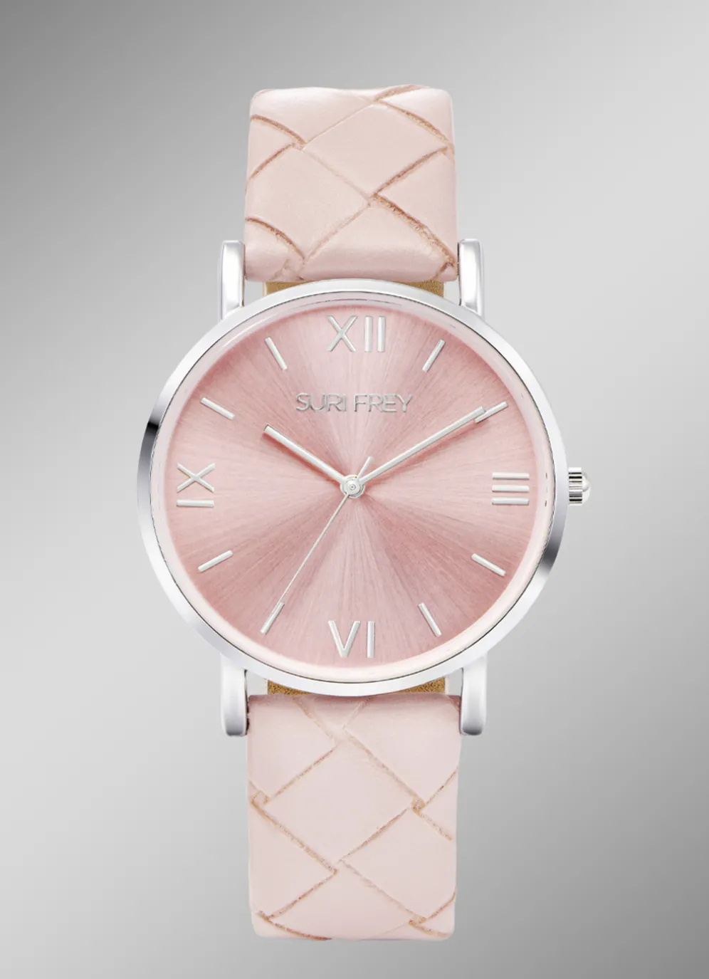 Entdecken Sie die Eleganz der Suri Frey Damenuhr – ein Accessoire, das Stil und Funktionalität perfekt vereint. Mit ihrem 36 mm Metallgehäuse und dem spritzwassergeschützten Design ist diese Uhr nicht nur ein modisches Statement, sondern auch ein zuverlässiger Begleiter für den Alltag. Das Herzstück bildet ein präzises Quarzwerk, das Genauigkeit garantiert, während das Mineralglas für klare Sicht und Schutz sorgt. Abgerundet wird das Design durch ein roséfarbenes Kunstlederband mit einer klassischen Dornschließe, das einen Hauch von Farbe und Komfort bietet. Ob im Büro oder beim Abendessen – die Suri Frey Damenuhr ist die perfekte Wahl für jede Gelegenheit.