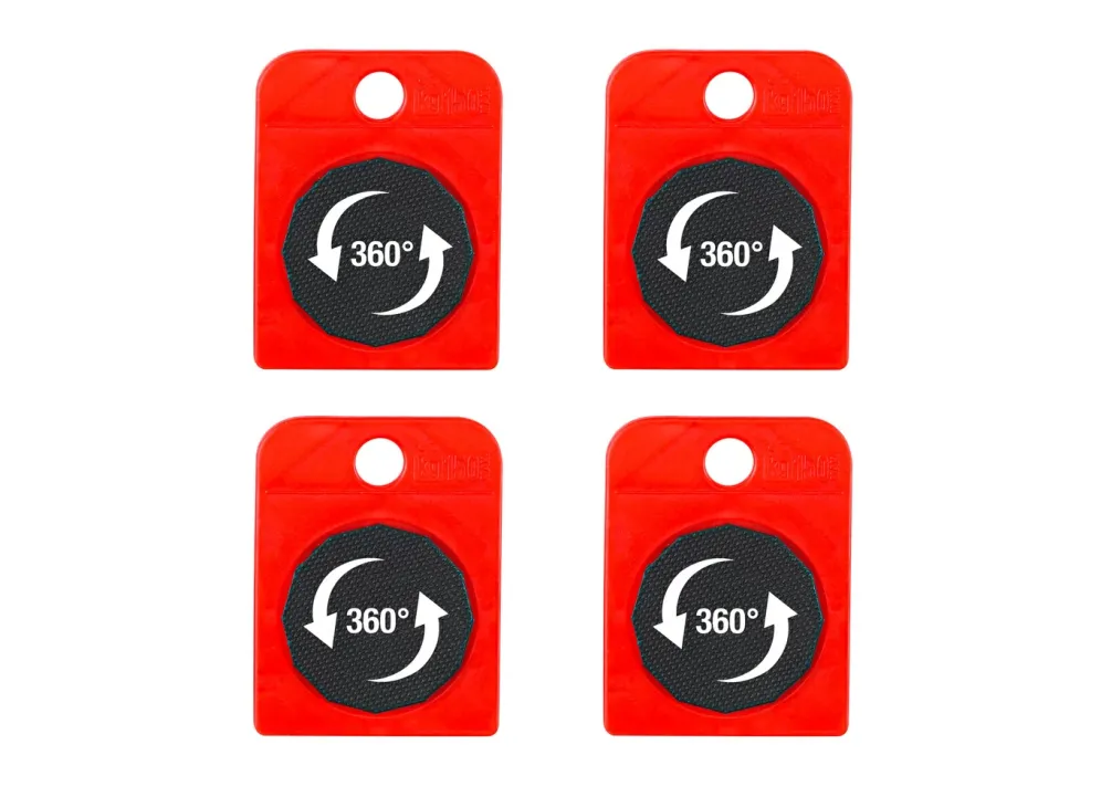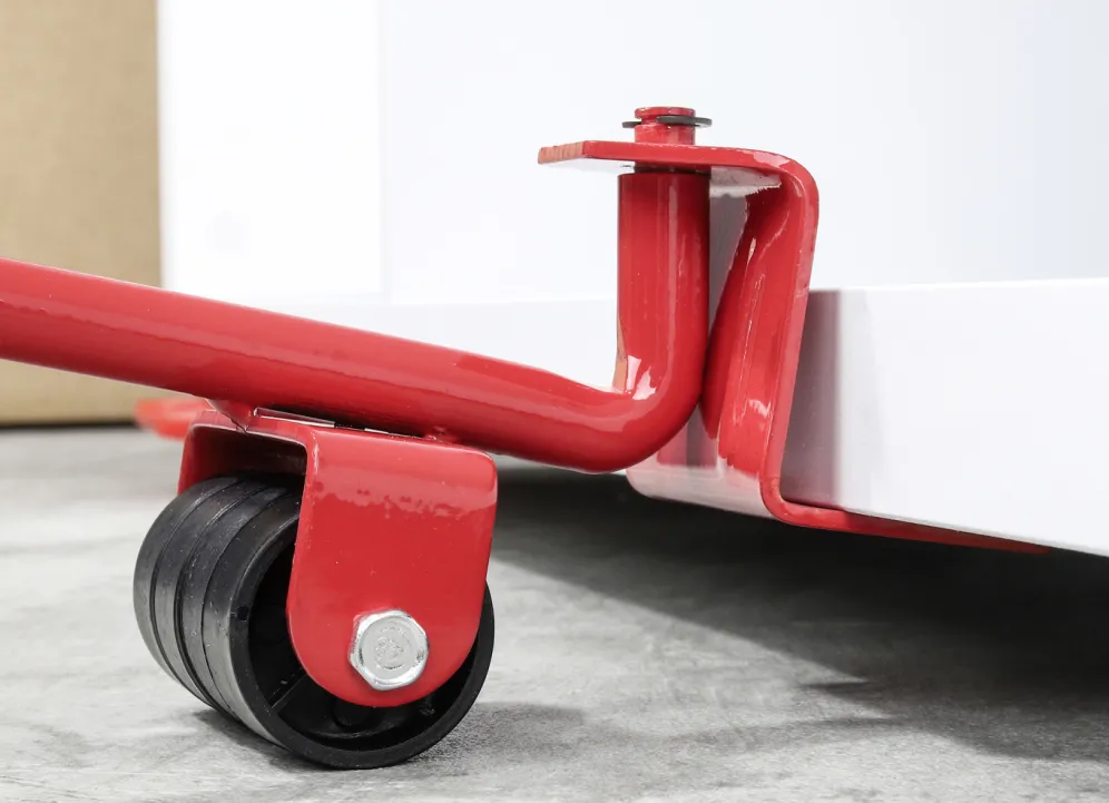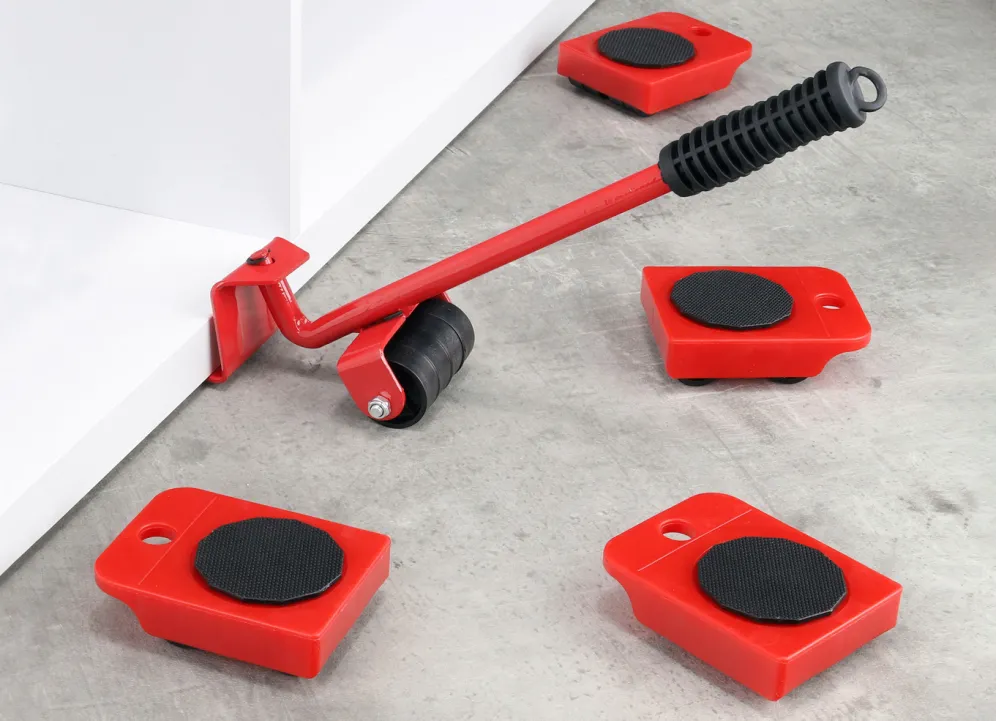 Möbel-Heber und 4 Transport-Rollen in Rot-Schwarz.