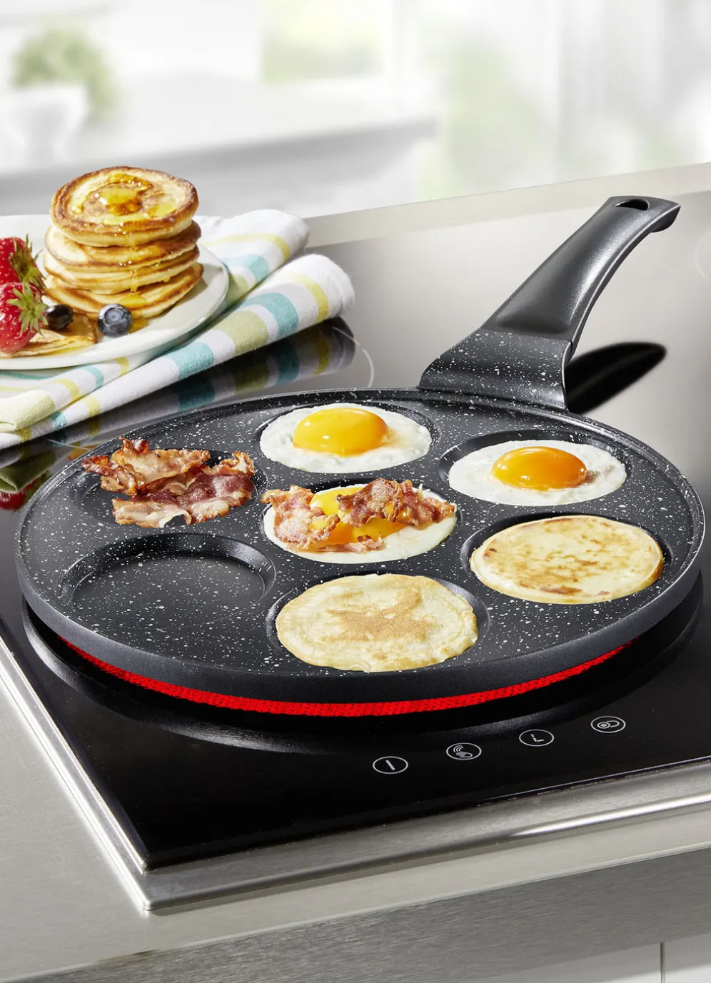Muldenpfanne – ideal für die Zubereitung von Pancakes, Spiegeleiern, Tortillas, Kartoffelpuffern, Hamburger-Patties uvm. Dank der ø 7,8cm und 0,7cm tiefen Mulden werden die Speisen gleich groß, gleich dick und makellos rund. Aus Aluguss mit Antihaftbeschichtung, kein Anbrennen und Anhaften. Griff wird nicht heiß.